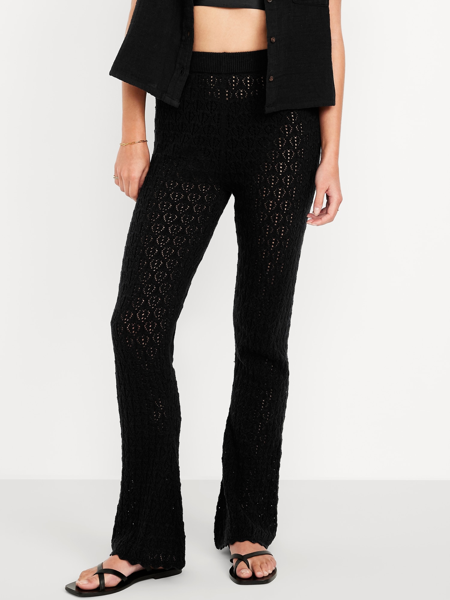 High-Waisted Crochet Flare Pants: pull-on elastic waistband, scallop hem, pair back to our matching crochet top, #761571