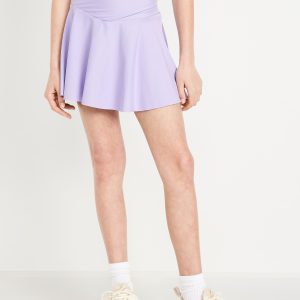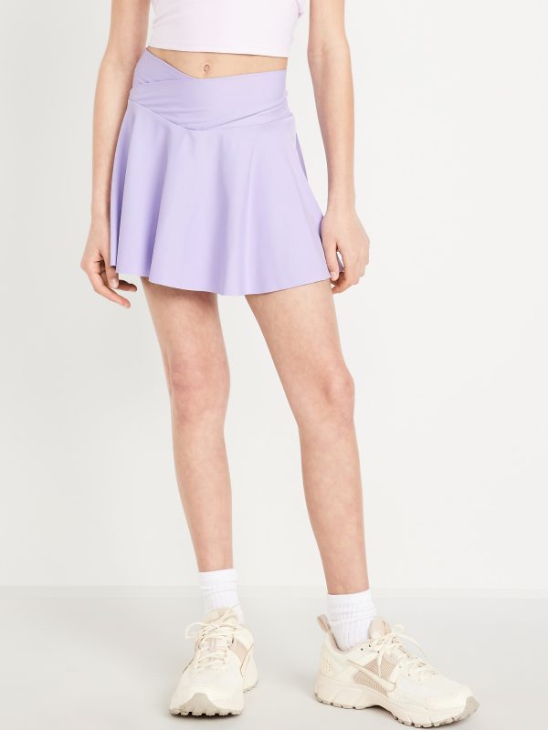 High-Waisted Crossover PowerSoft Skort for Girls: built-in biker shorts, high-rise, crossover elasticized waistband, mini-length skirt, side pocket on shorts, easy pull-on style, #696570