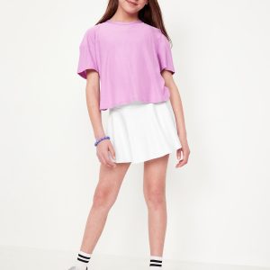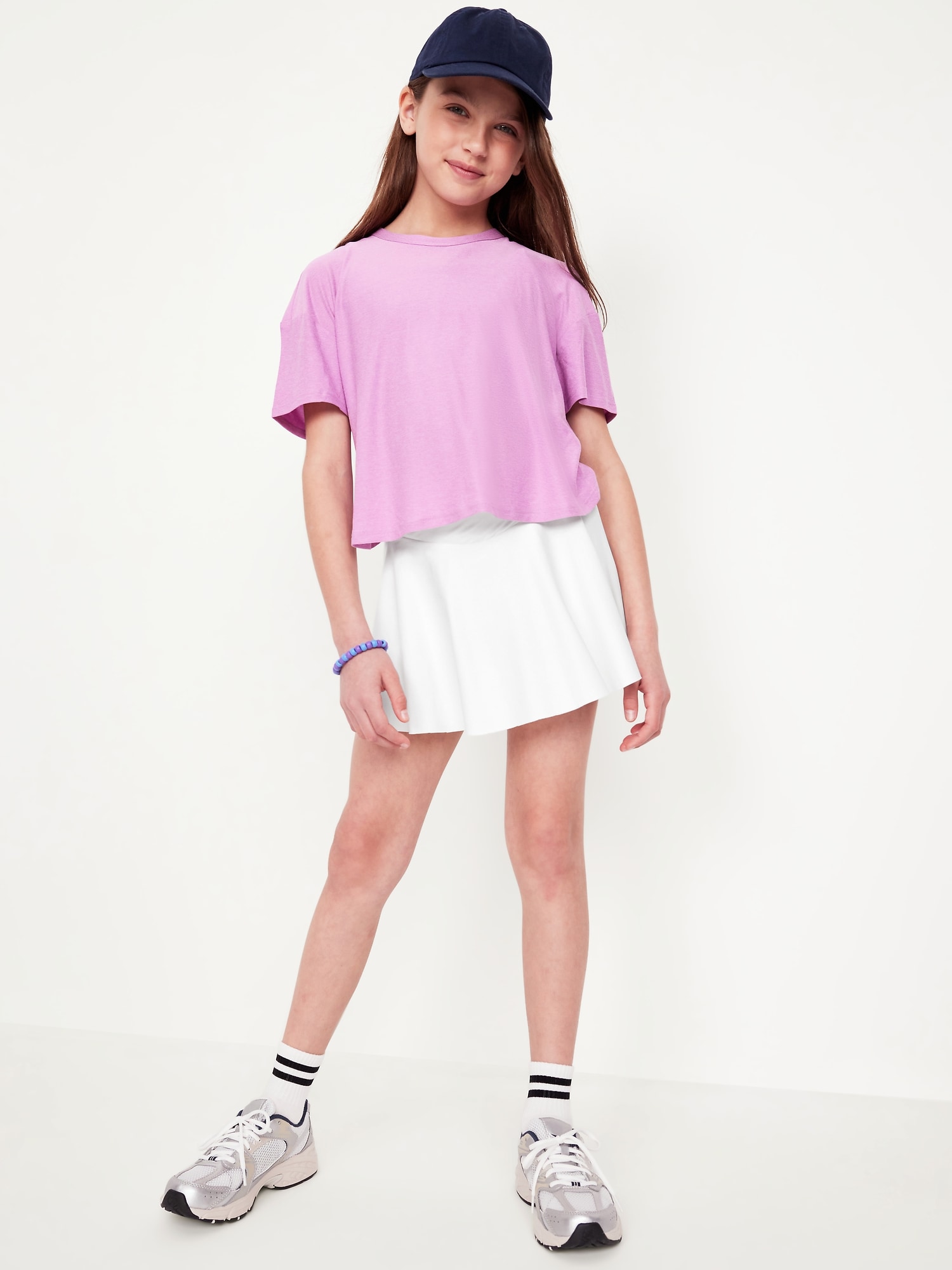 High-Waisted Crossover PowerSoft Skort for Girls: built-in biker shorts, high-rise, crossover elasticized waistband, mini-length skirt, side pocket on shorts, easy pull-on style, #696570