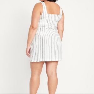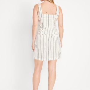 High-Waisted Linen-Blend Mini Skirt: elasticized back waist, hidden left seam zipper, back right welt pocket, pull-on style, vertical striped print, #705375