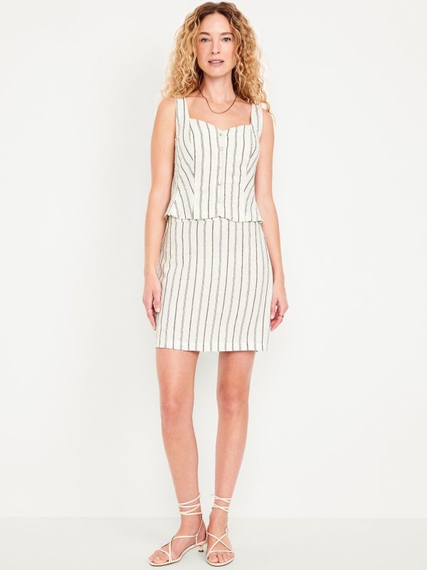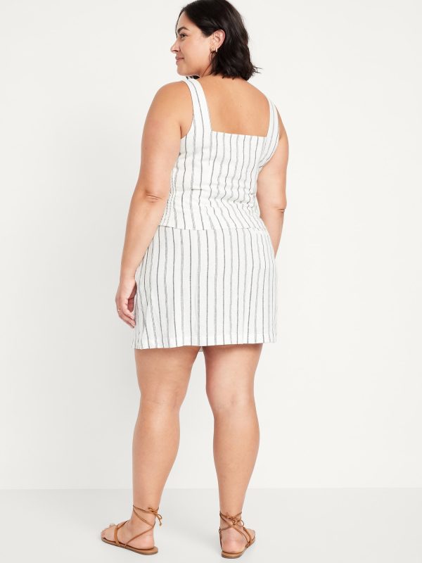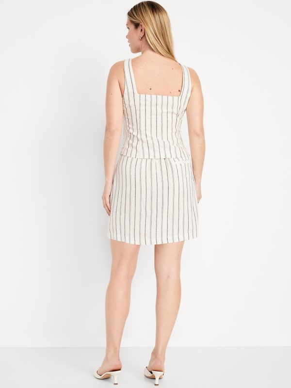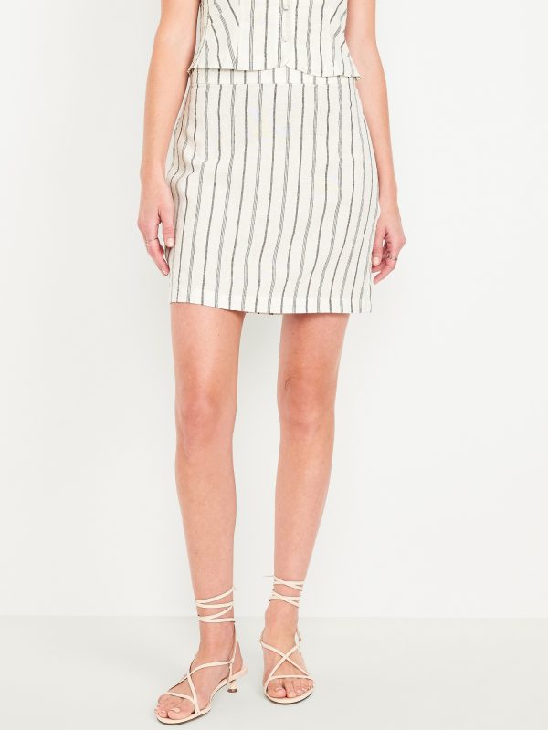 High-Waisted Linen-Blend Mini Skirt: elasticized back waist, hidden left seam zipper, back right welt pocket, pull-on style, vertical striped print, #705375