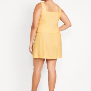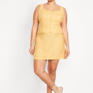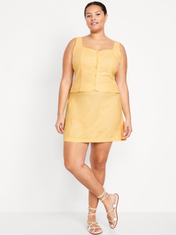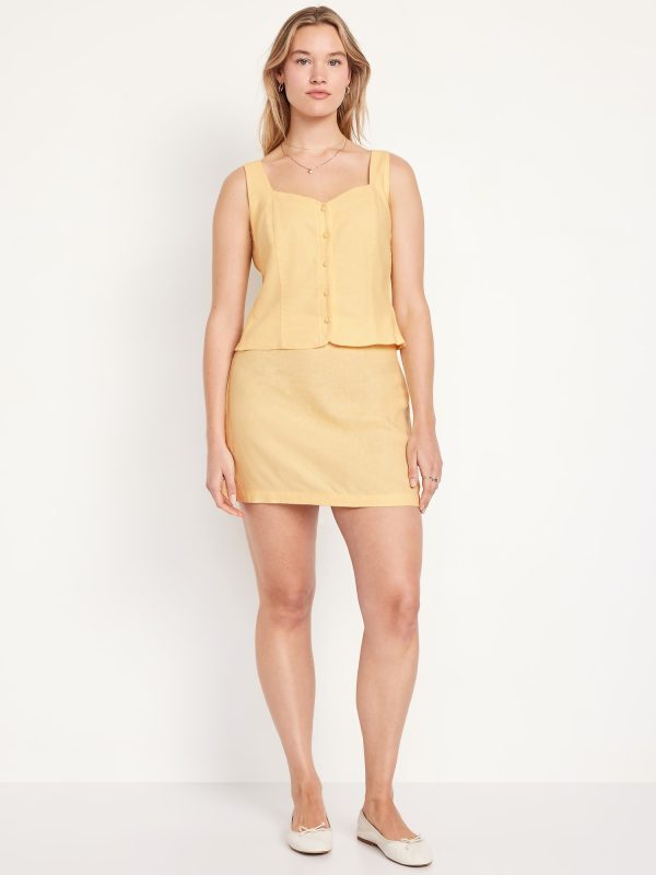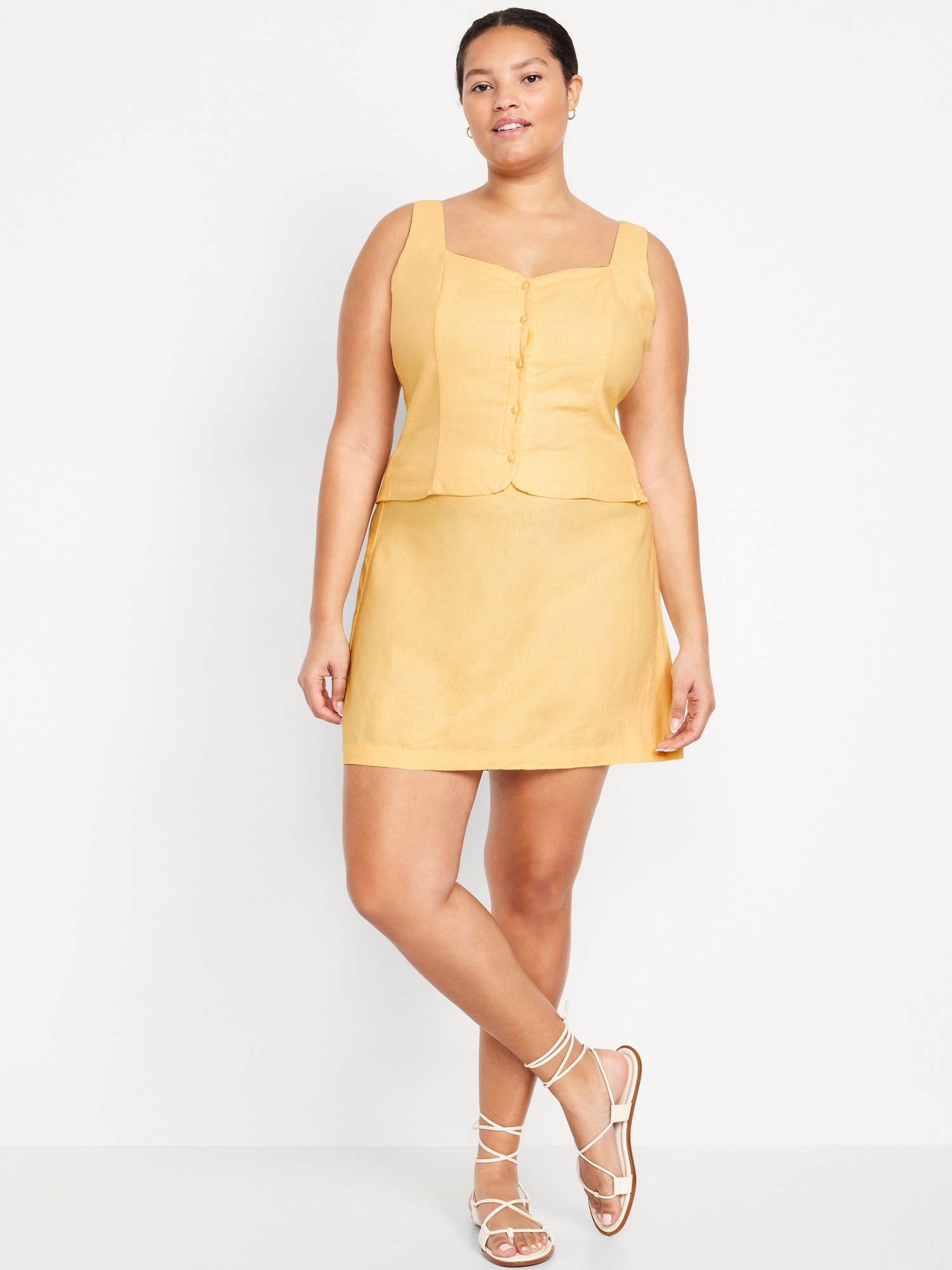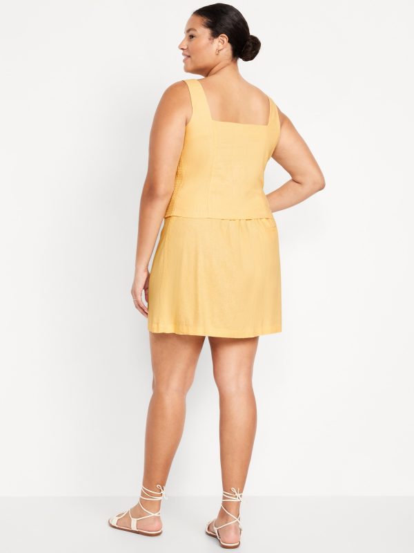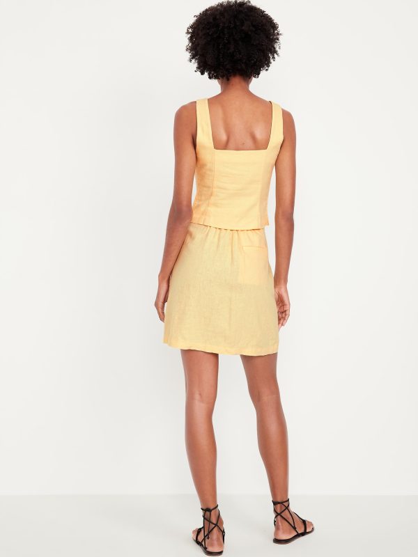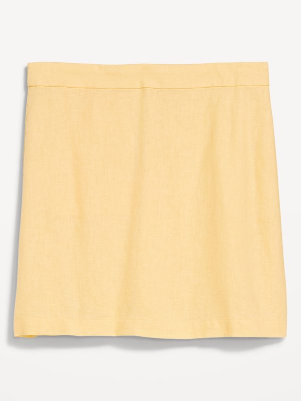 High-Waisted Linen-Blend Mini Skirt: elasticized back waist, hidden left seam zipper, back right welt pocket, pull-on style, vertical striped print, #705375