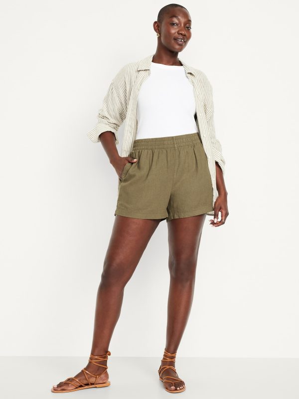 High-Waisted Linen-Blend Shorts — 3.5-inch inseam: comfort elastic waistband, on-seam hip pockets, back patch pockets, easy pull-on style, #693453