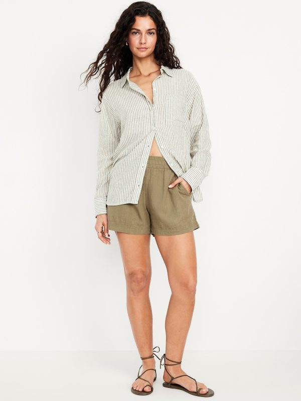 High-Waisted Linen-Blend Shorts — 3.5-inch inseam: comfort elastic waistband, on-seam hip pockets, back patch pockets, easy pull-on style, #693453