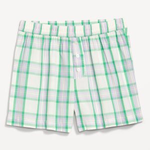 High-Waisted Poplin Boxer Pajama Shorts: elastic waistband, decorative button fly, plaid print, #798497