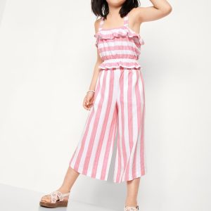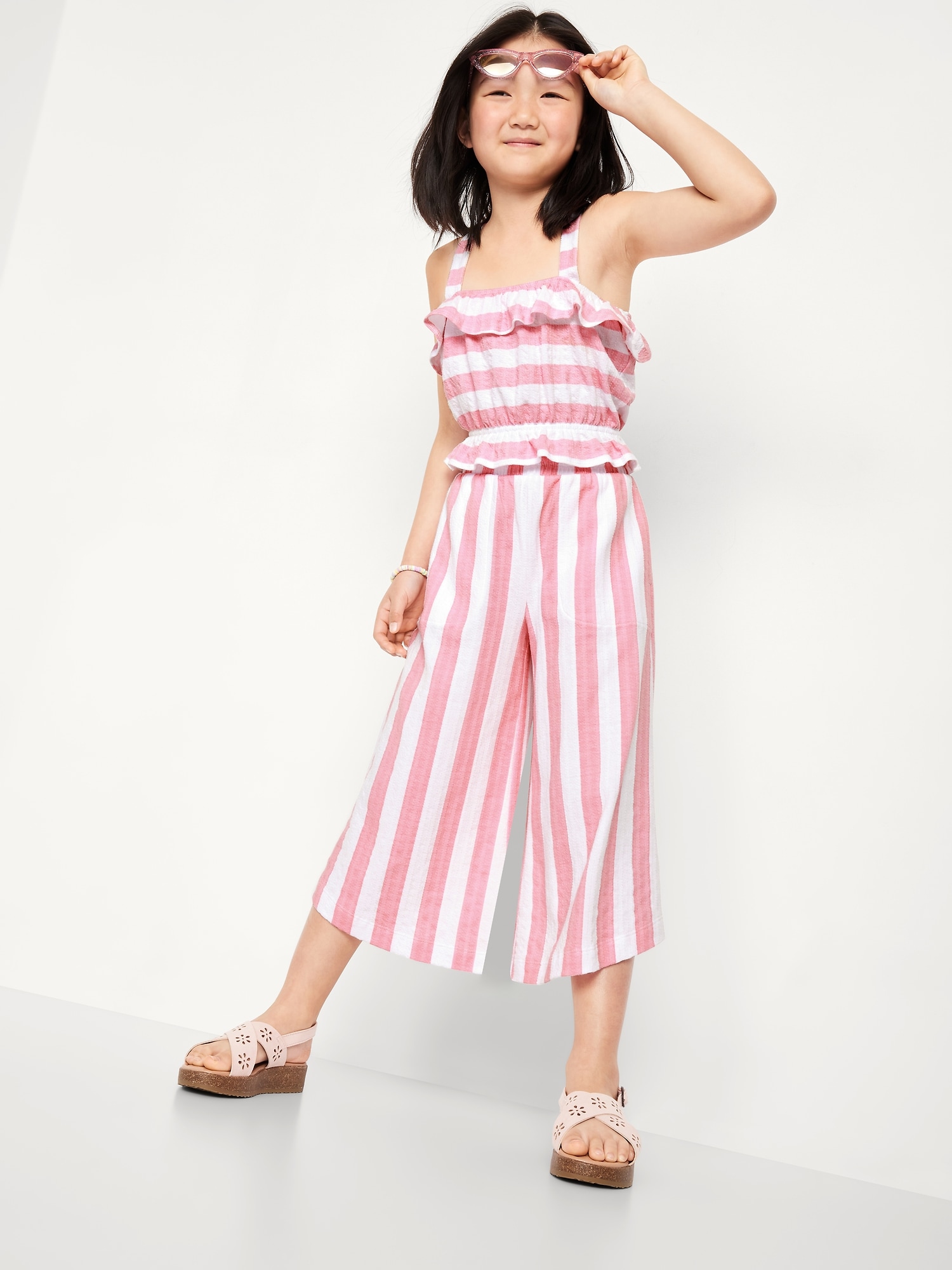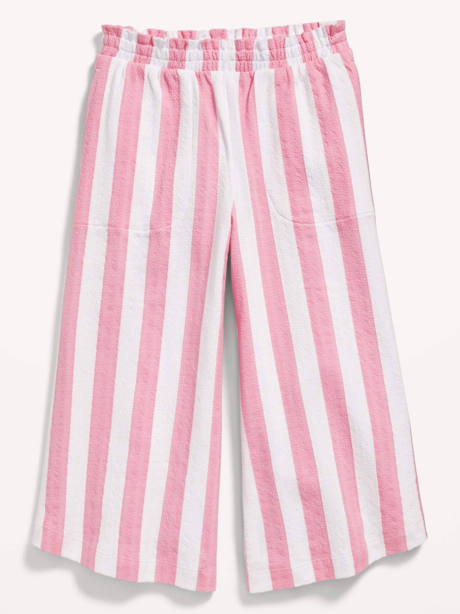 High-Waisted Pucker Wide-Leg Pants for Girls: ruffle elastic waistband, on-seam pockets, curved leg, wide contrasting stripes, #767120