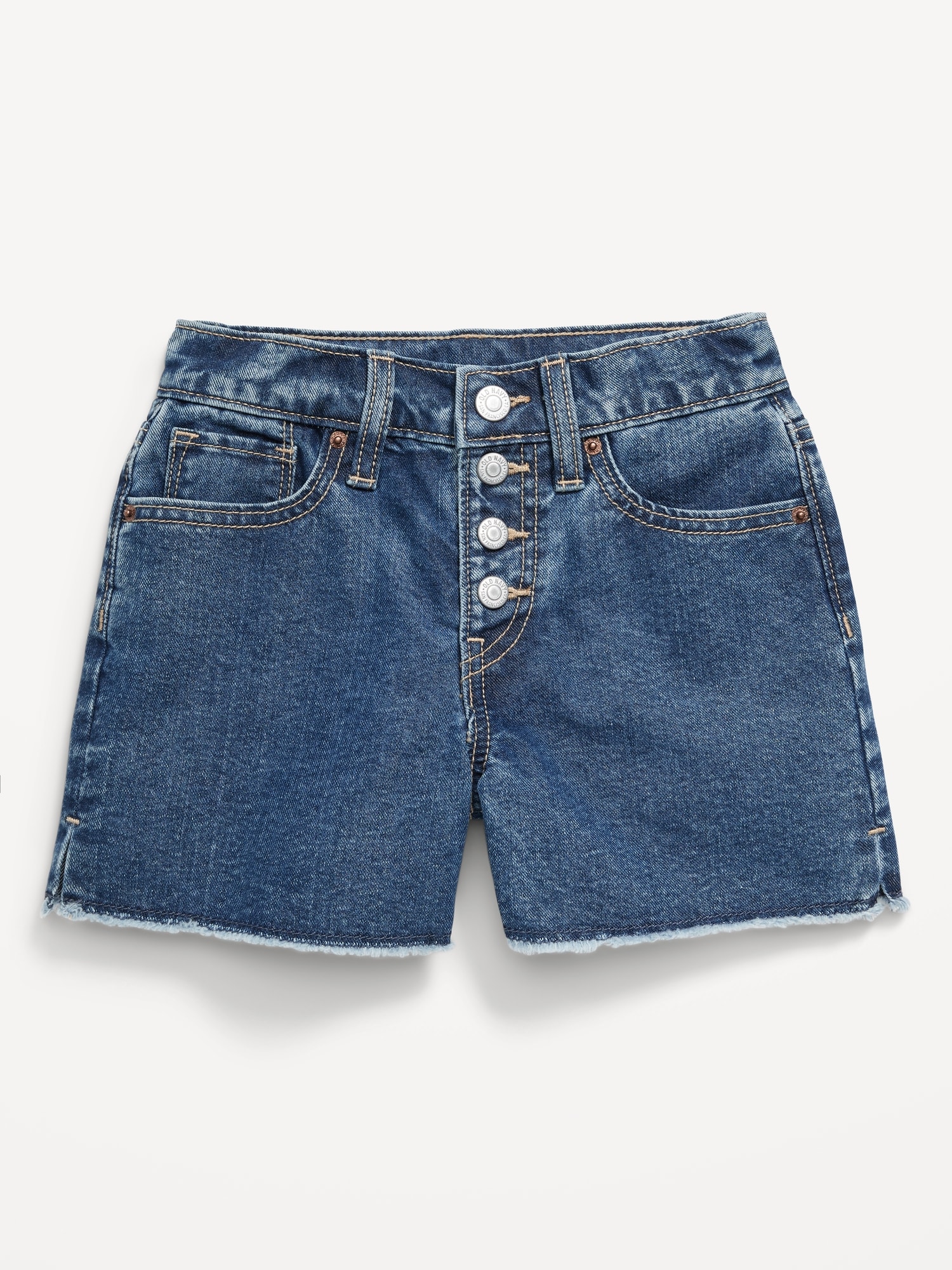 High-Waisted Wow Frayed-Hem Jean Shorts for Girls: contoured interior adjustable waistband, sizes 5-8 snap-button closure, sizes 10-20 regular button closure, regular 3 button-fly closure sizes 10-20, snap-button 3 button-fly closure sizes 5-8, scoop pockets and coin pocket at front, patch pockets at back, frayed leg openings create a lived-in look, side slits, #418243