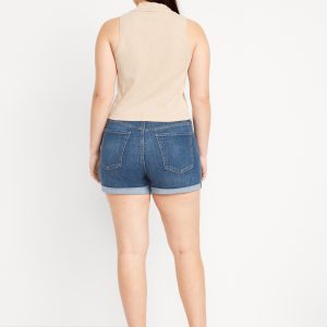 High-Waisted Wow Jean Shorts — 3-inch inseam: button front, belt loops, zip fly, front scoop pockets, back patch pockets, cuffed hem, #890124