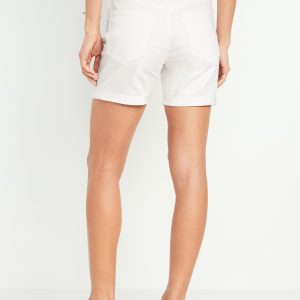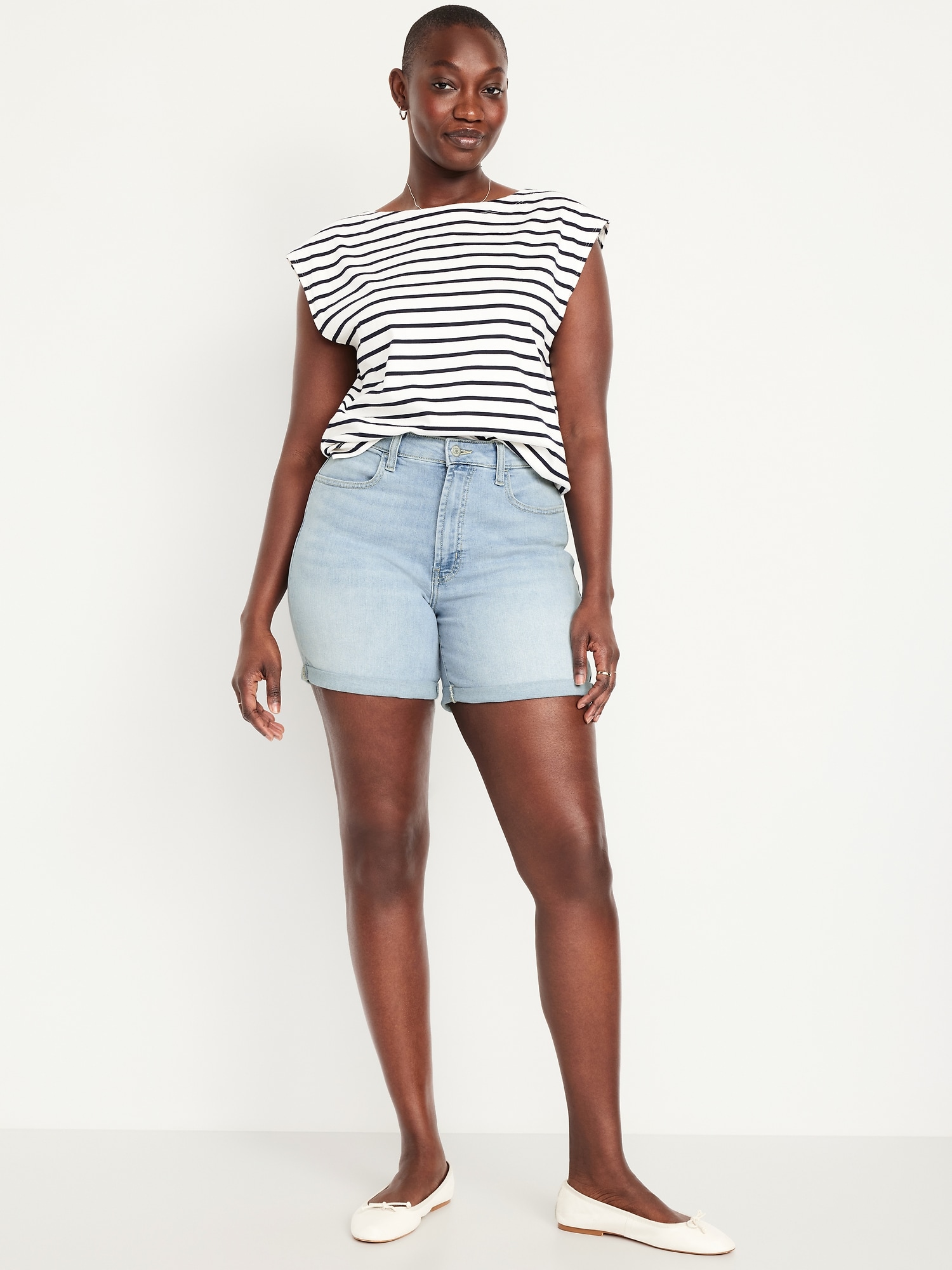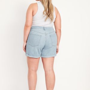 High-Waisted Wow Jean Shorts — 5-inch inseam: button front, zip fly, zip fly, front scoop pockets, back patch pockets, cuffed hem, #849408