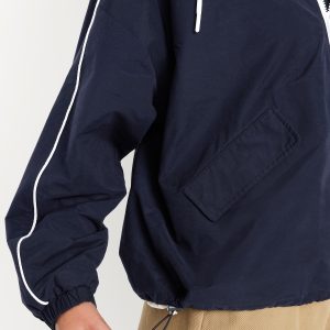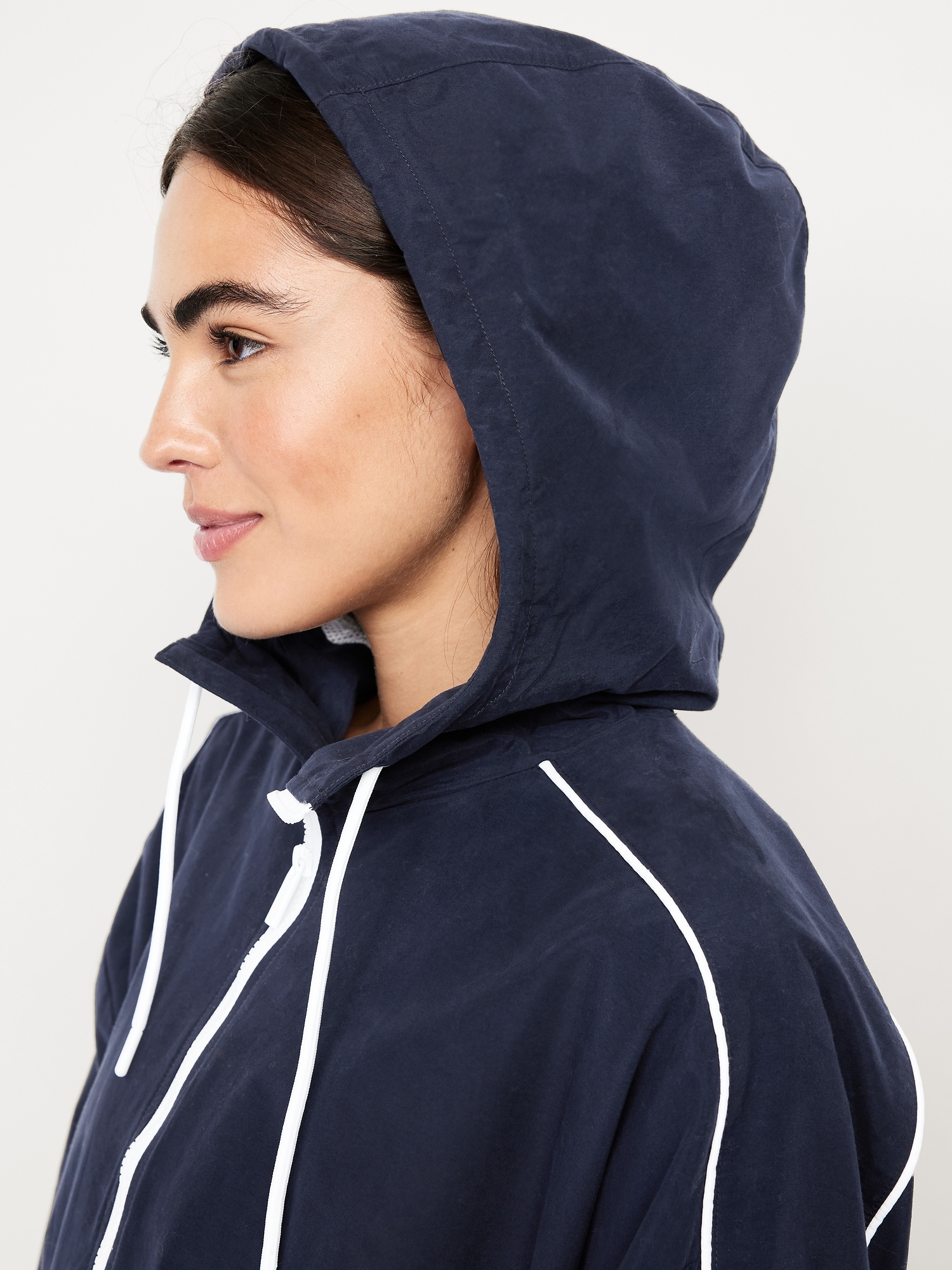 Hooded Zip Windbreaker: drawcord hood, long sleeves with contrasting piping, elastic cuffs, full-zip front, front flap pockets, bungee hem, #844570