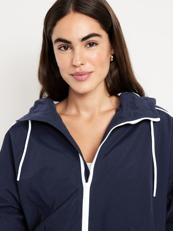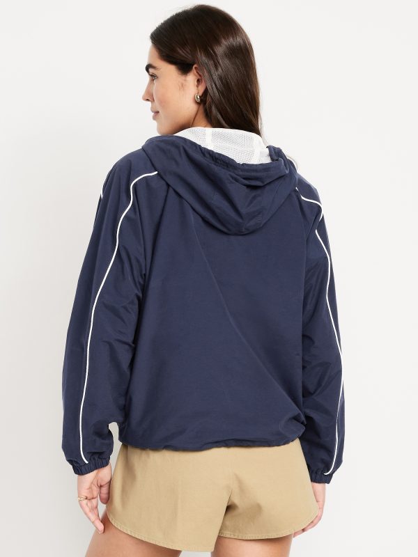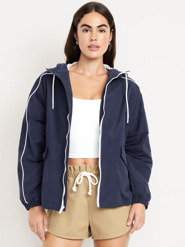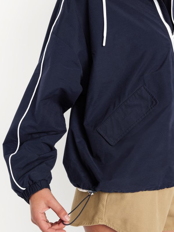 Hooded Zip Windbreaker: drawcord hood, long sleeves with contrasting piping, elastic cuffs, full-zip front, front flap pockets, bungee hem, #844570