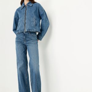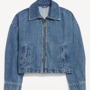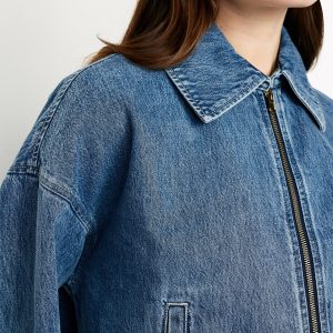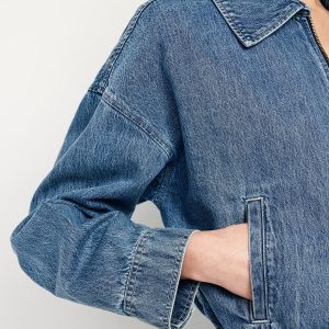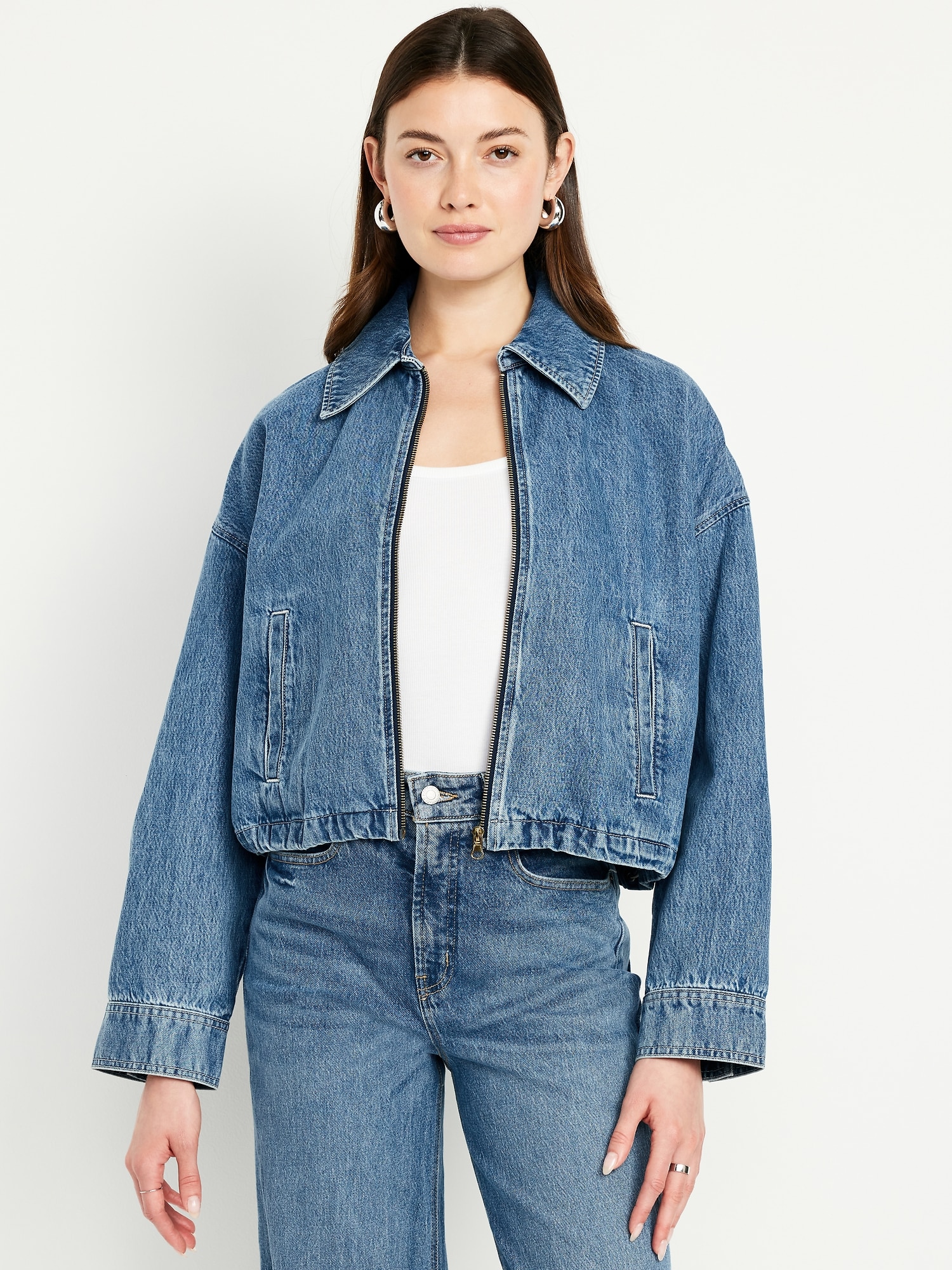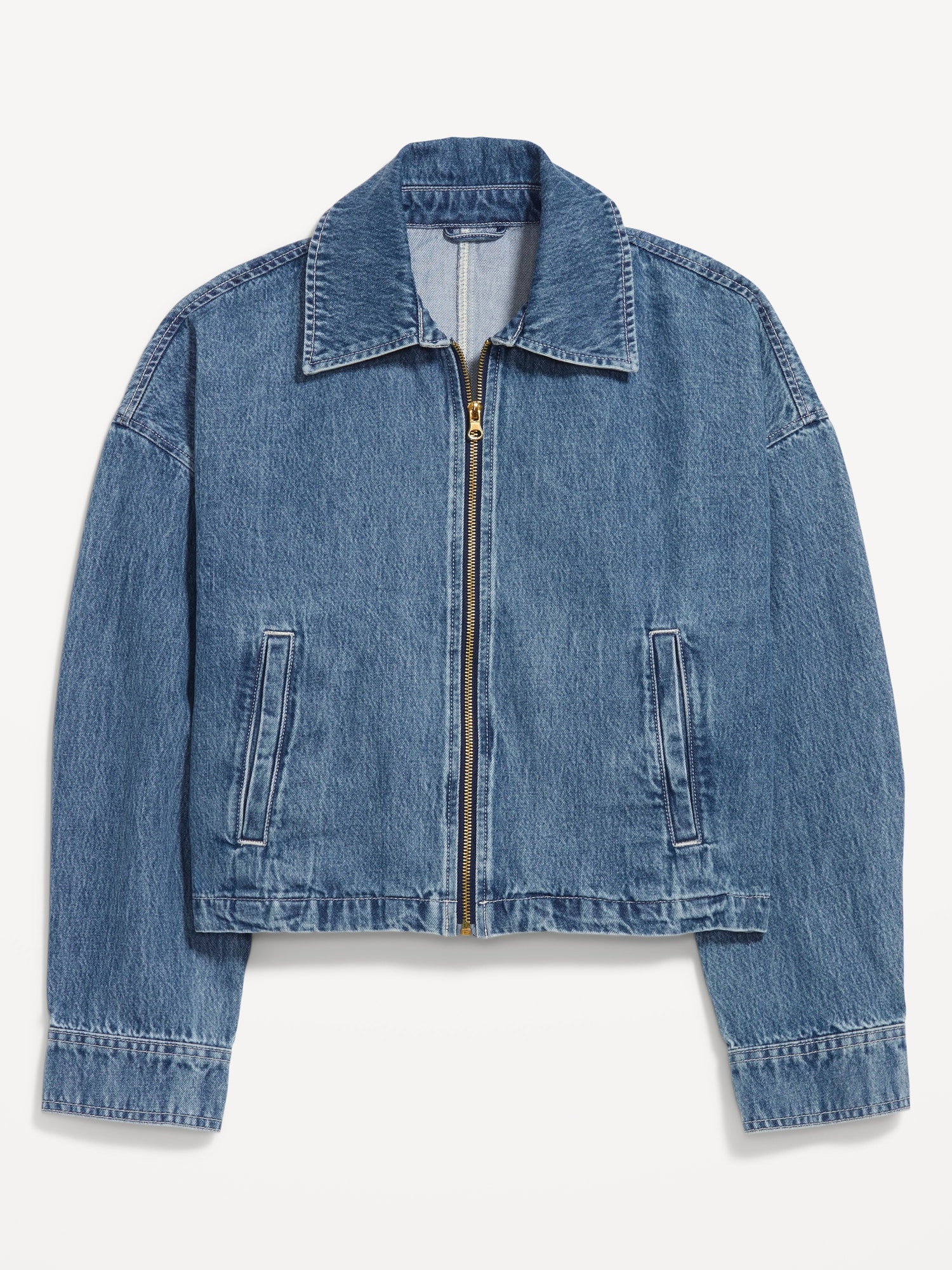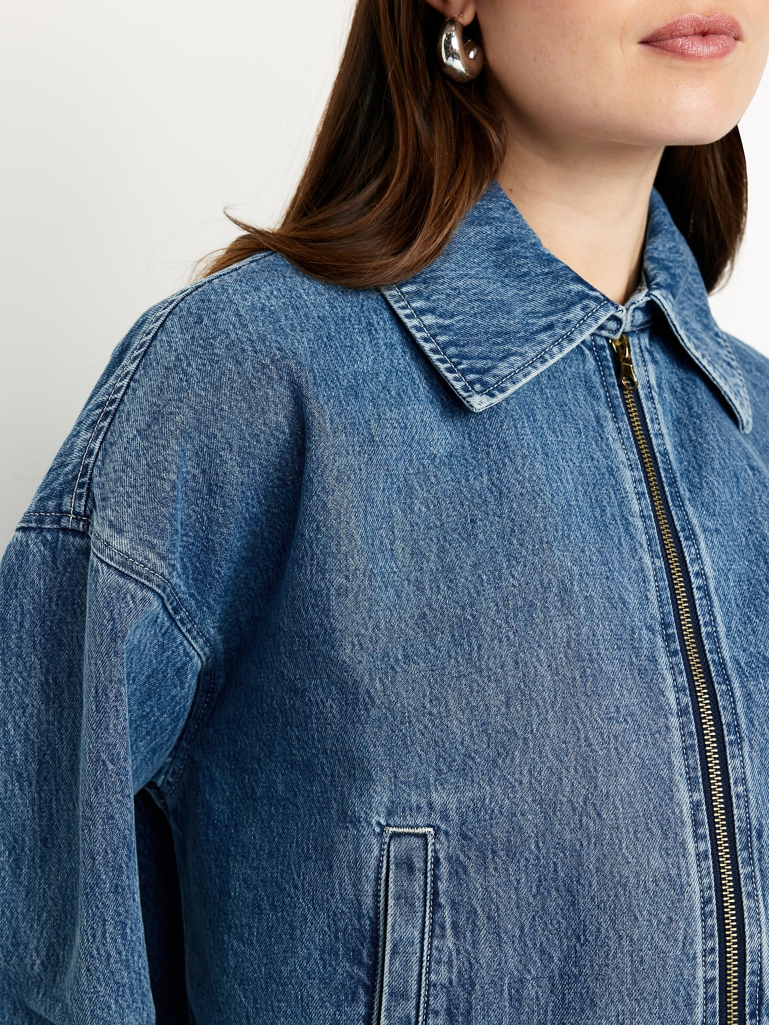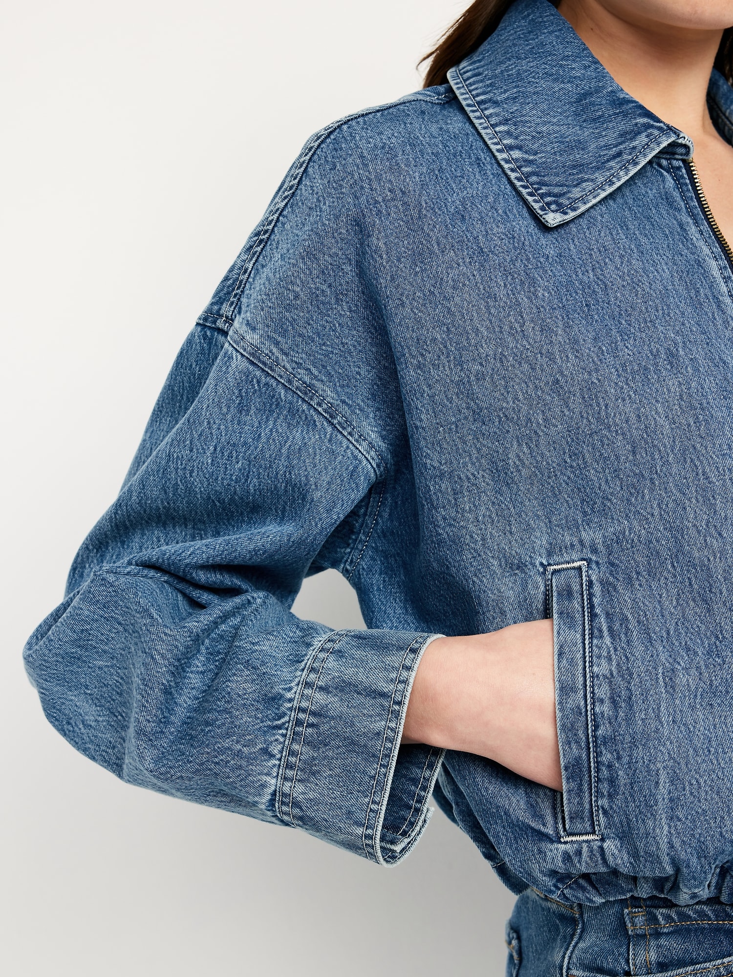 Jean Zip Jacket: spread collar, drop-shoulder sleeves with snap cuffs, full-zip front, welt pockets, cinched hem, #790492