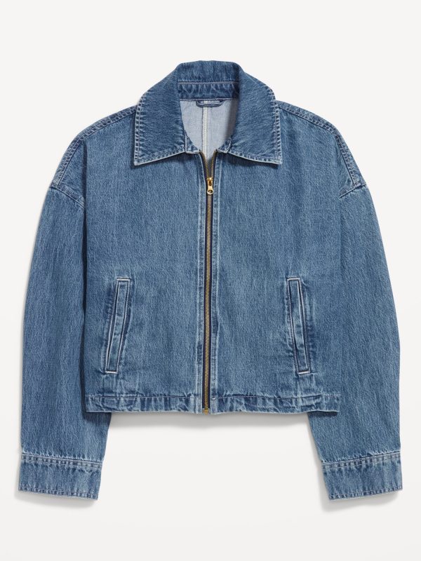 Jean Zip Jacket: spread collar, drop-shoulder sleeves with snap cuffs, full-zip front, welt pockets, cinched hem, #790492