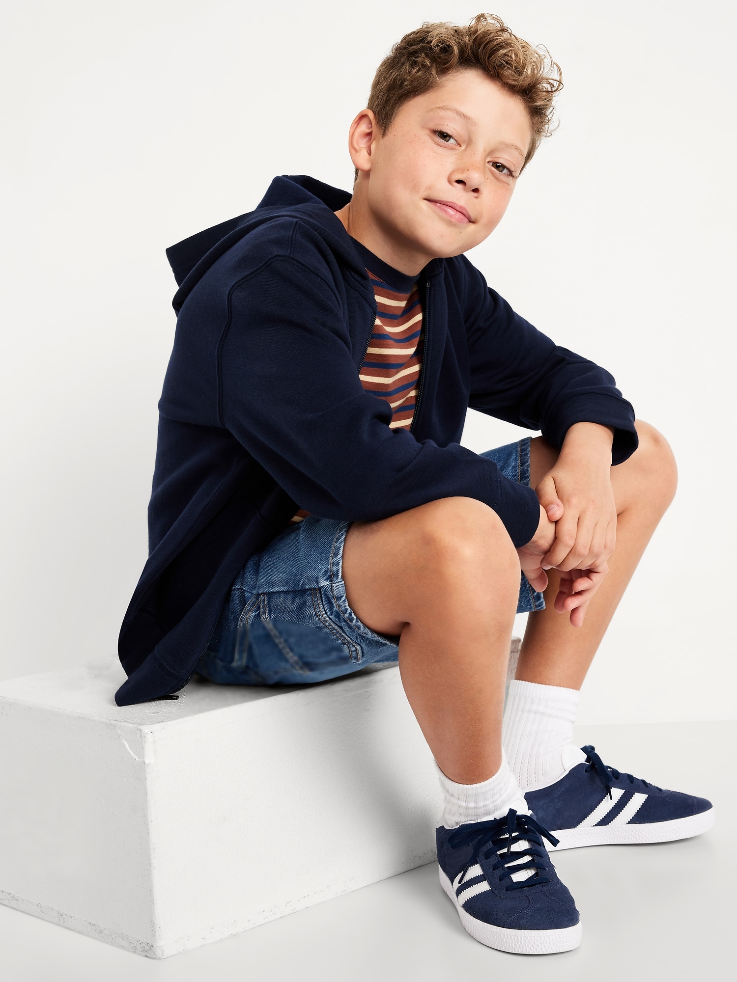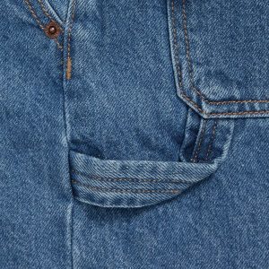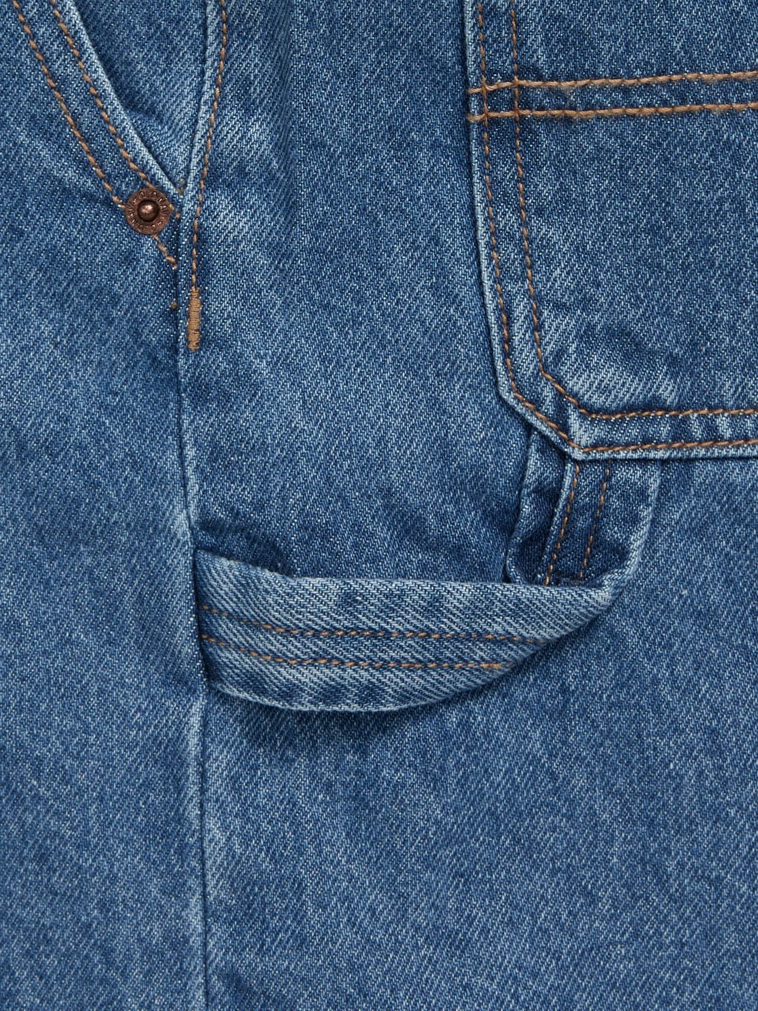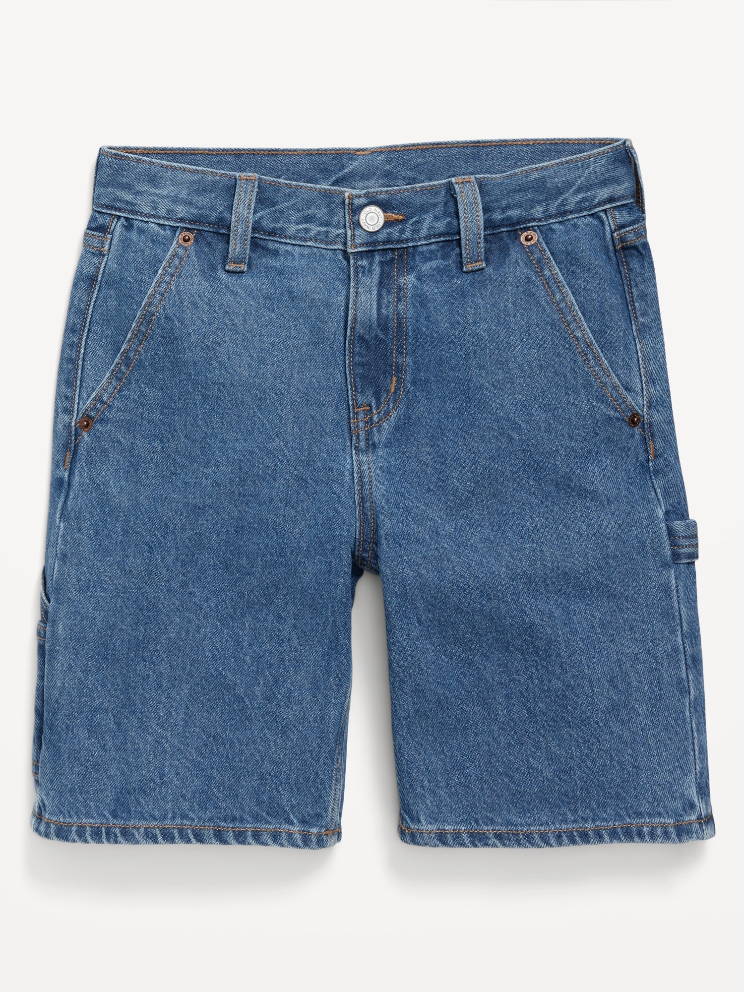 Knee Length Baggy Carpenter Jean Shorts for Boys: interior adjustable waistband, snap-button closure in sizes 5-8, regular button closure in sizes 10-20, zip fly, diagonal pockets at front, utility patch pockets at back and side of leg, built-in hammer loop at left leg, #681352