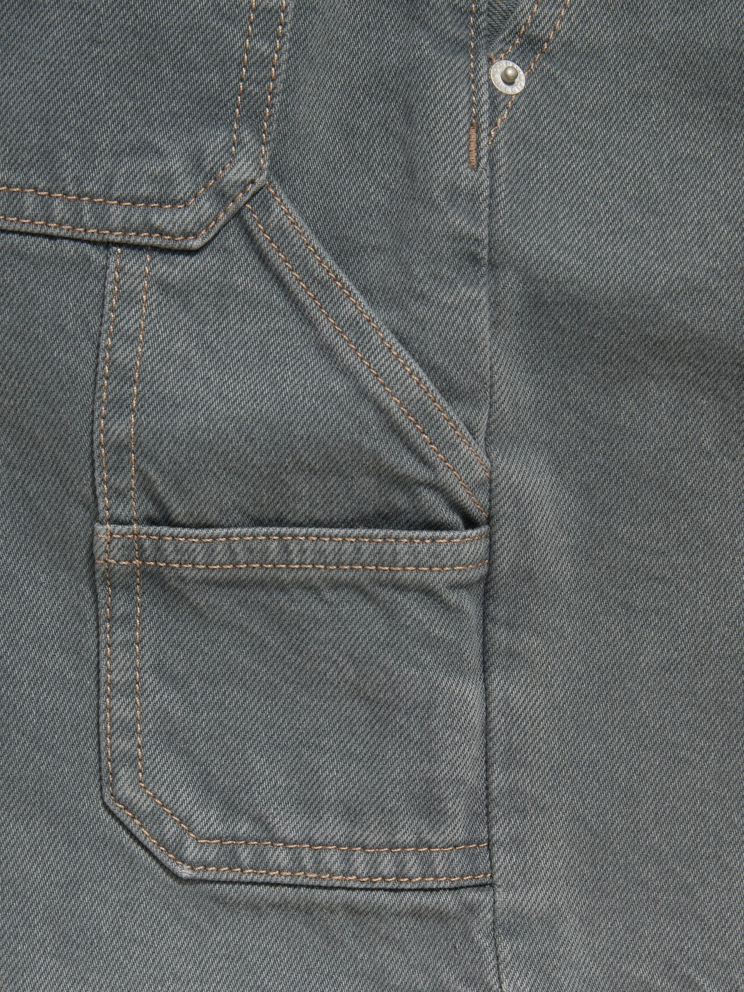 Knee Length Baggy Carpenter Jean Shorts for Boys: interior adjustable waistband, snap-button closure in sizes 5-8, regular button closure in sizes 10-20, zip fly, diagonal pockets at front, utility patch pockets at back and side of leg, built-in hammer loop at left leg, #681352