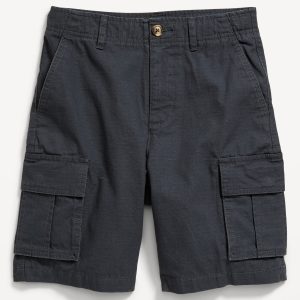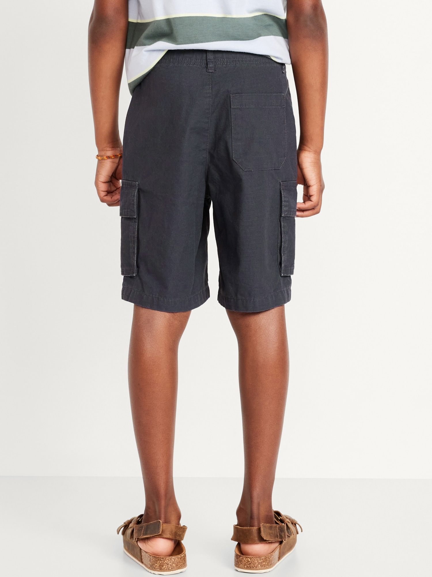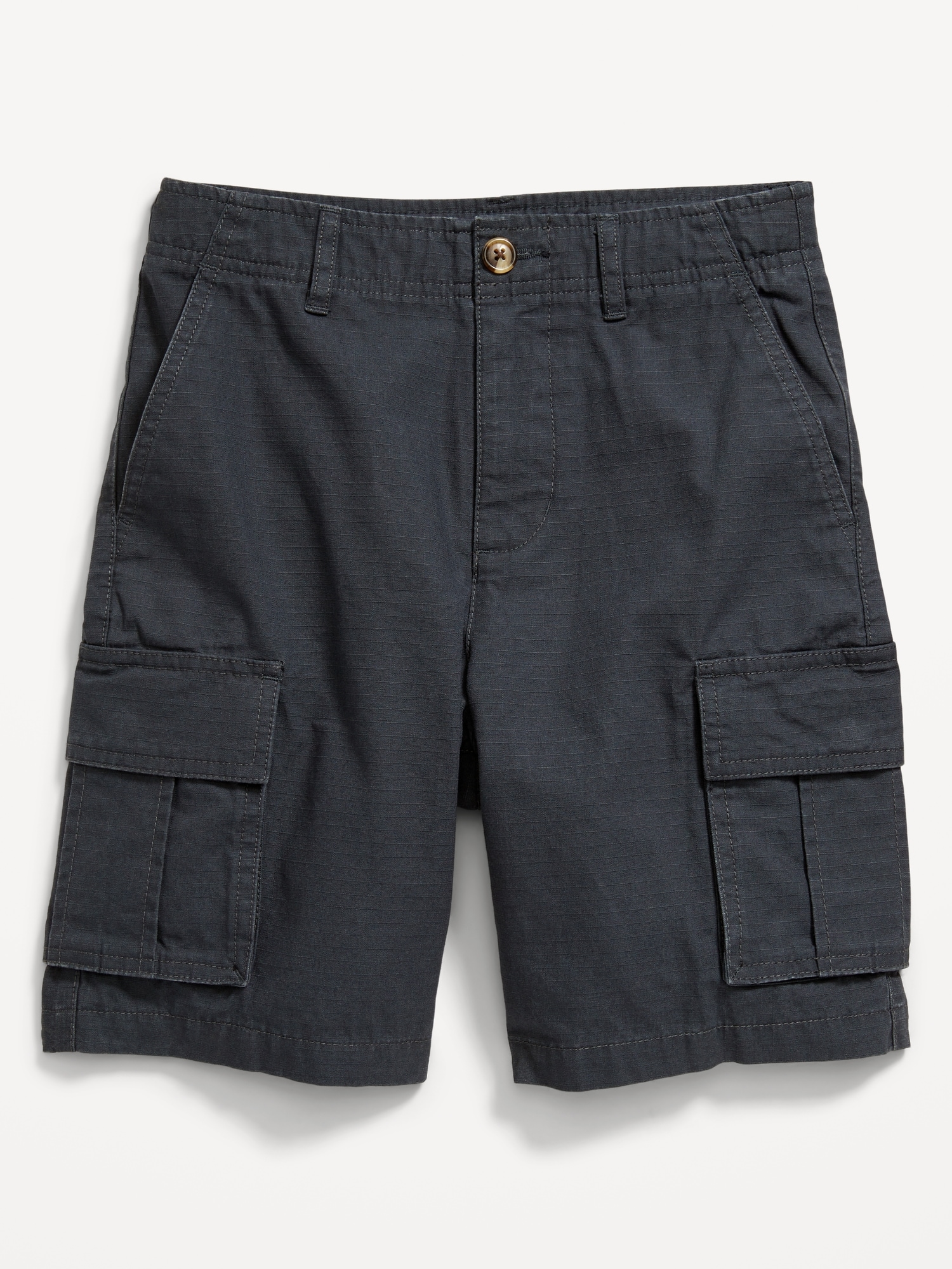 Knee Length Cargo Ripstop Shorts for Boys: interior adjustable waistband, button closure, zip fly, diagonal on-seam pockets, snap-button cargo pockets at each leg, single patch pocket at back, all-over print or solid color, #681416