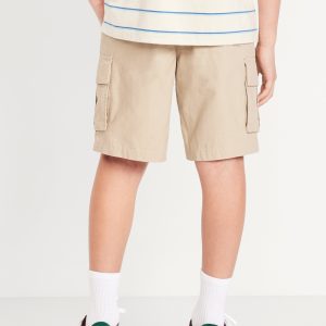Knee Length Cargo Ripstop Shorts for Boys: interior adjustable waistband, button closure, zip fly, diagonal on-seam pockets, snap-button cargo pockets at each leg, single patch pocket at back, all-over print or solid color, #681416