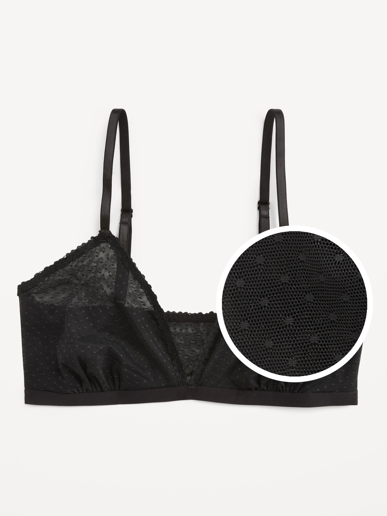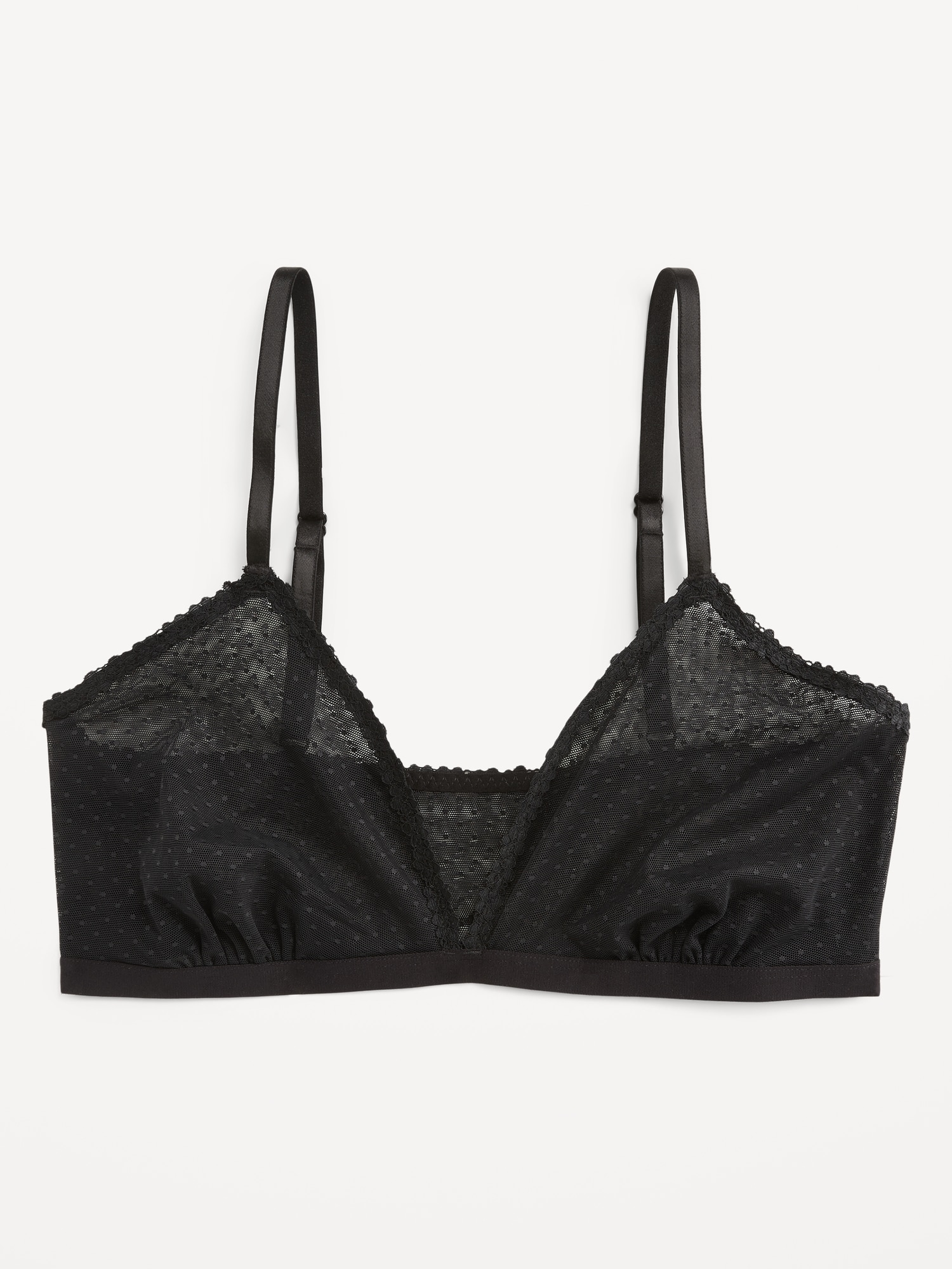 Lace-Trim Dot-Mesh Bralette: plunging v-neck, adjustable straps, brushed elastic hem, #800569