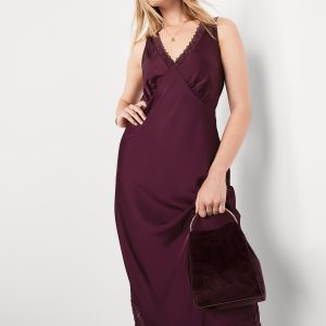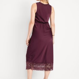 Lace-Trim Satin Midi Dress: lace-trim v-neck, sleeveless, seamed bodice, #798219