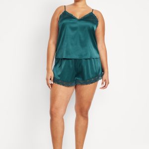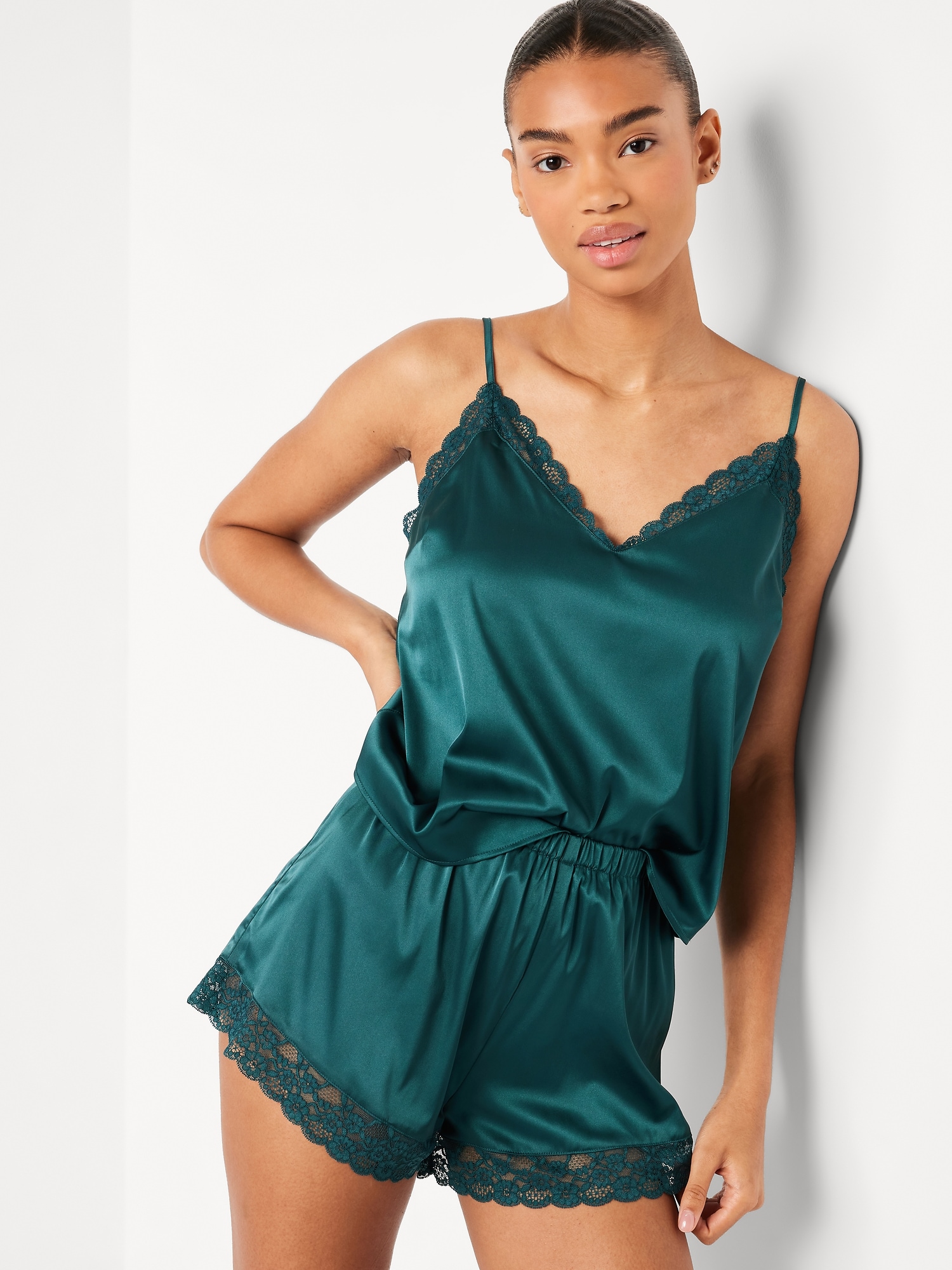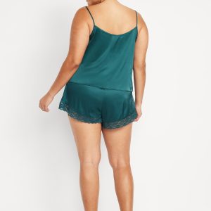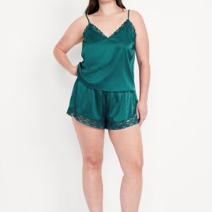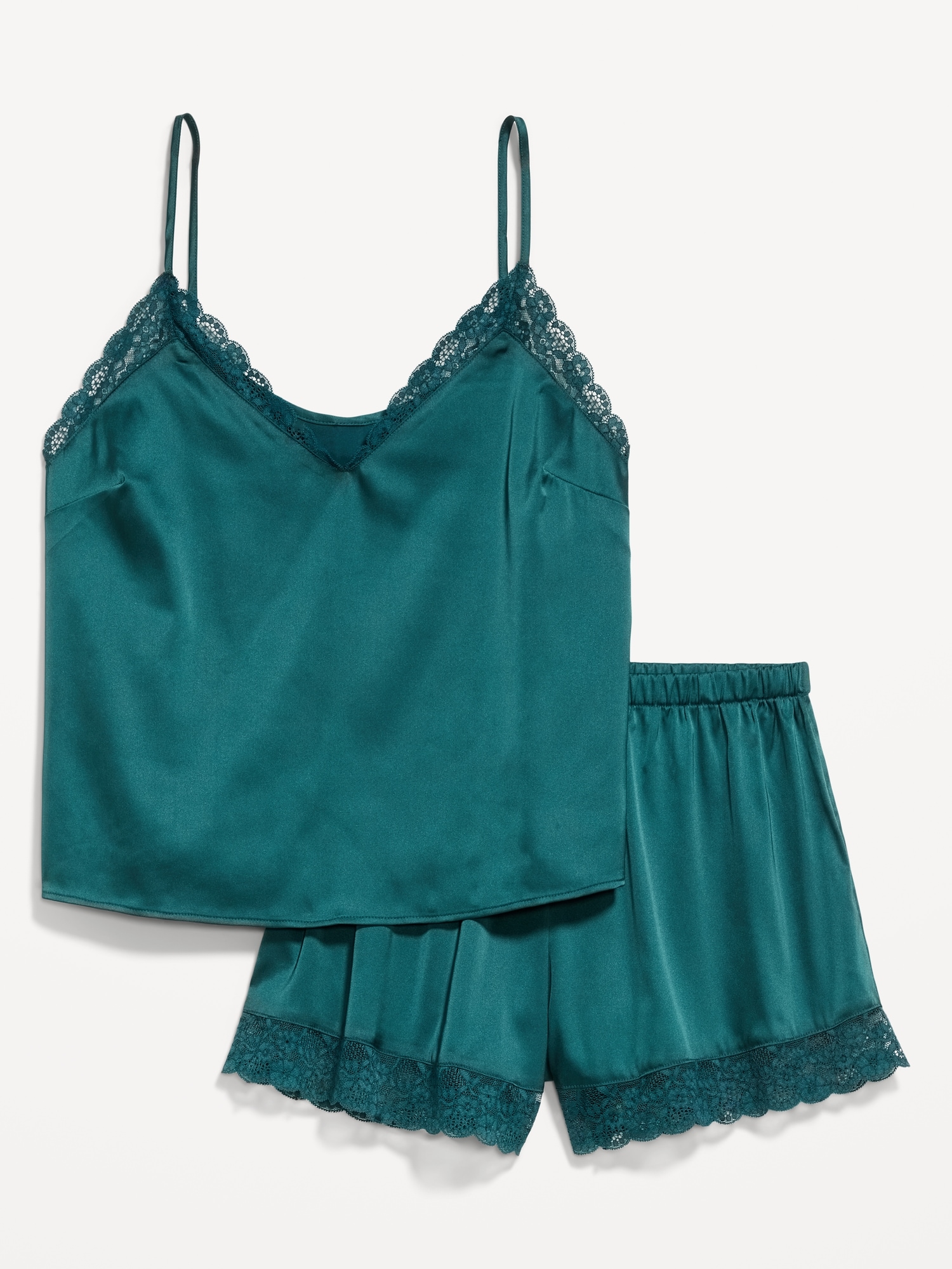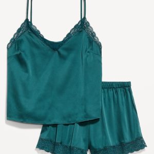 Lace-Trim Satin Pajama Short Set: set includes cami sleep top and matching shorts, lace-trim v-neck, spaghetti straps, elastic-waist shorts with lace hem, #808316