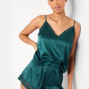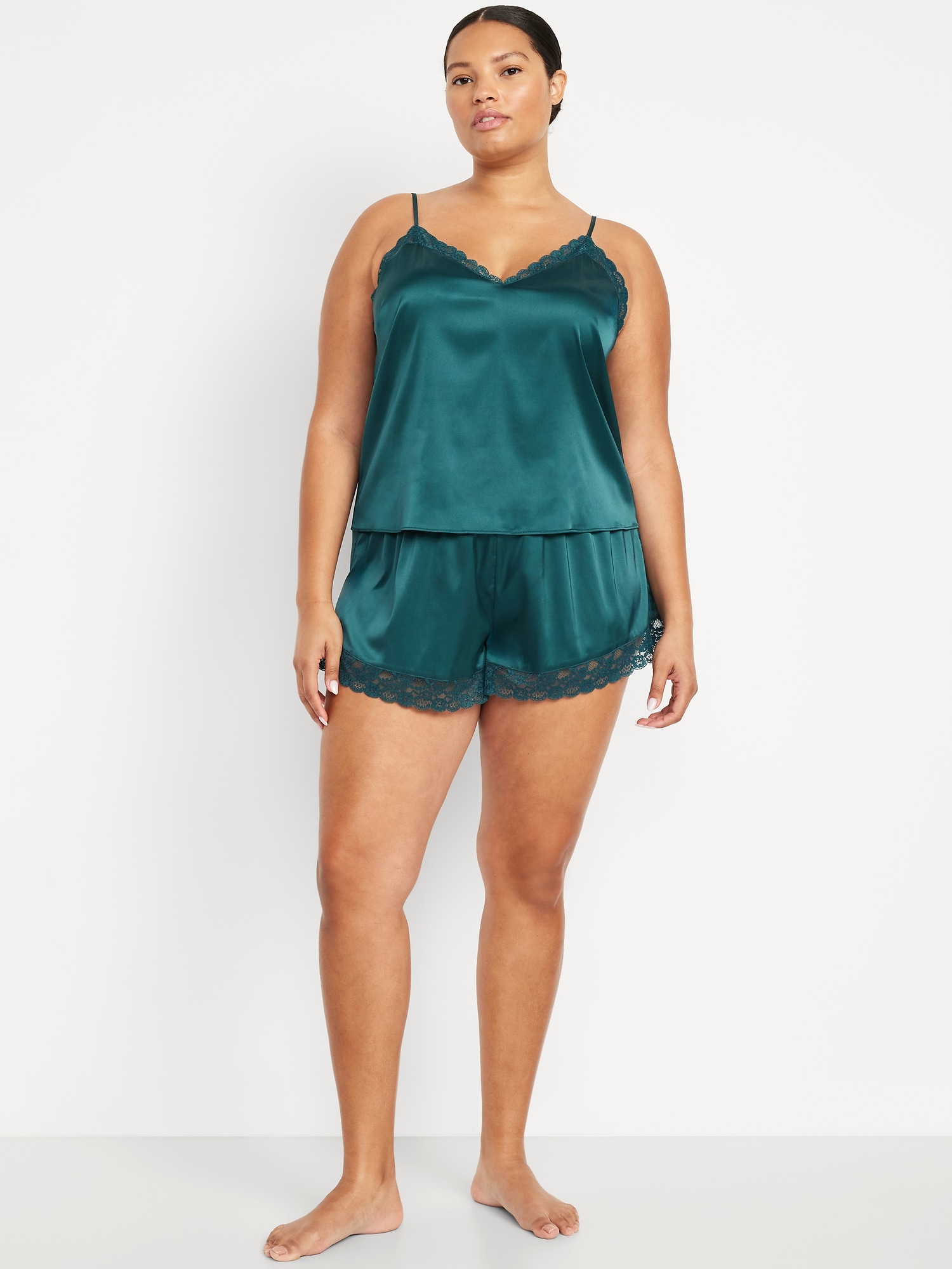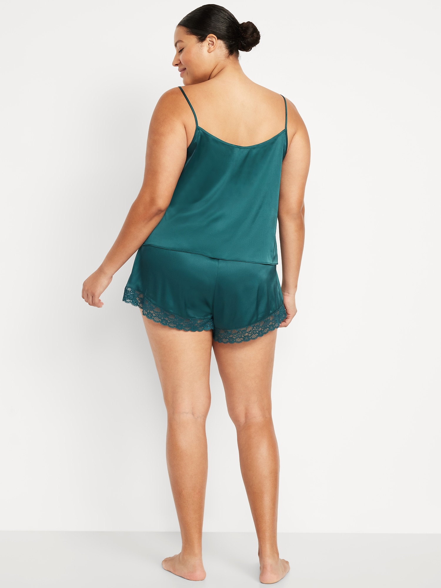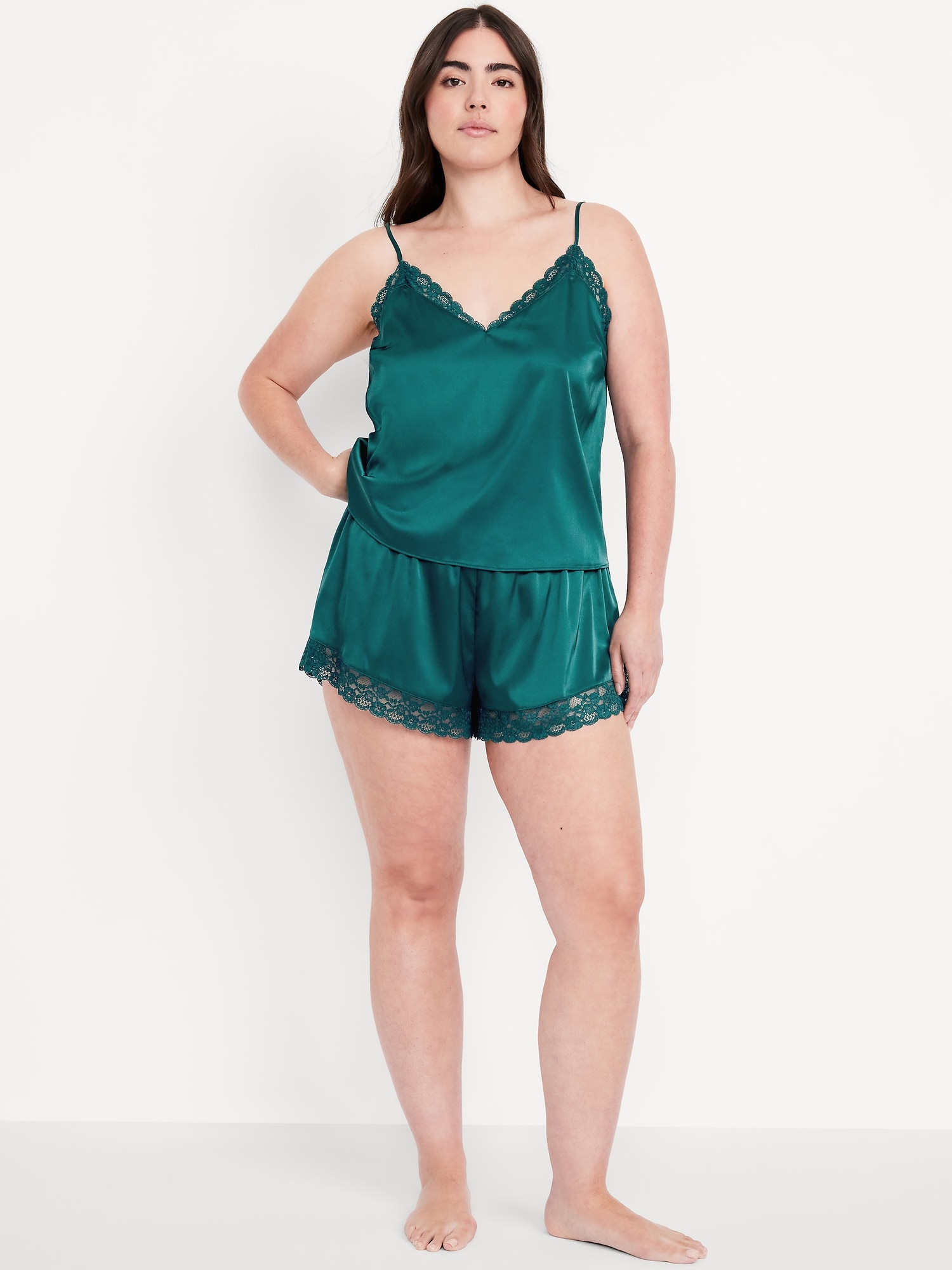 Lace-Trim Satin Pajama Short Set: set includes cami sleep top and matching shorts, lace-trim v-neck, spaghetti straps, elastic-waist shorts with lace hem, #808316