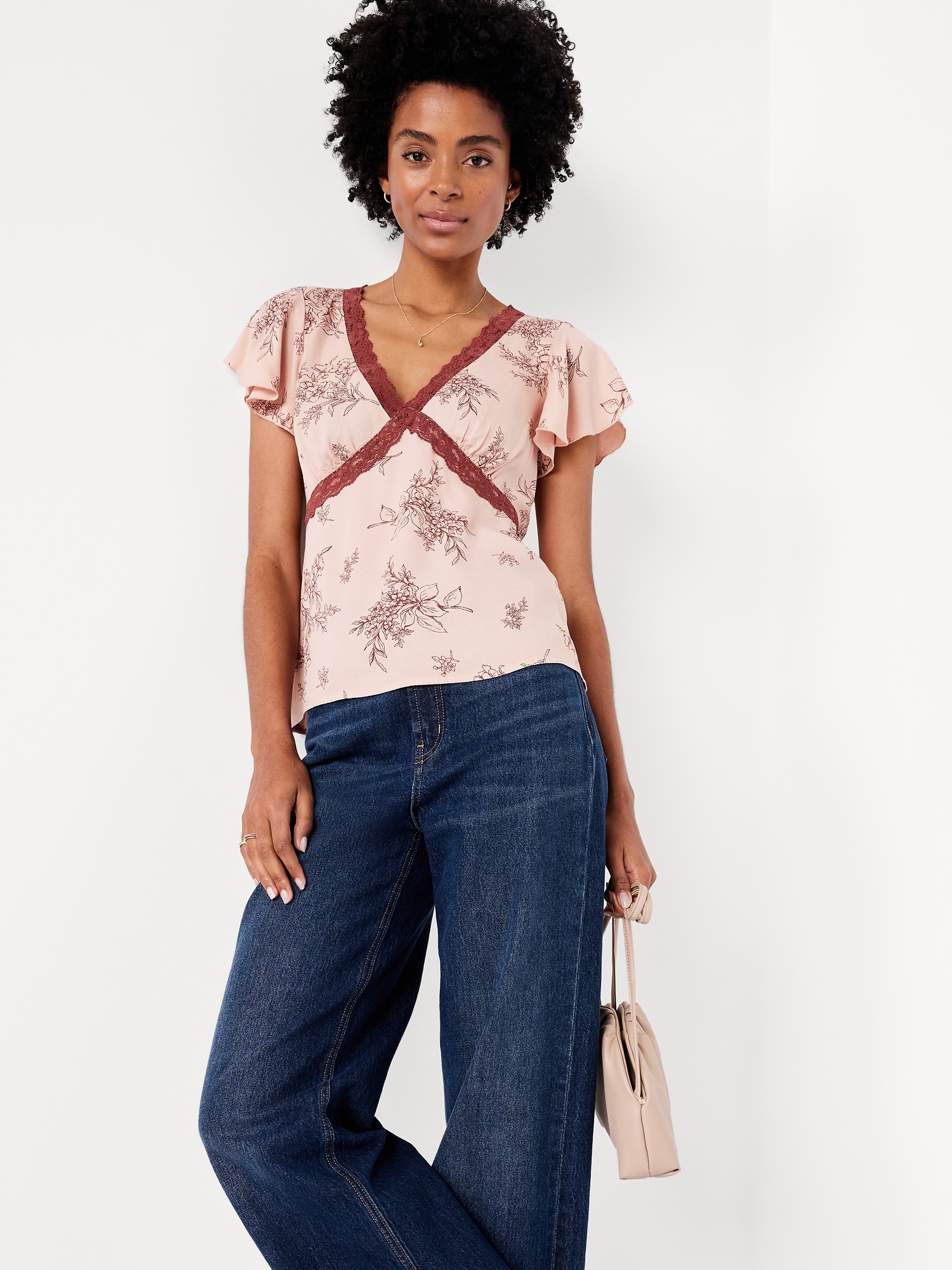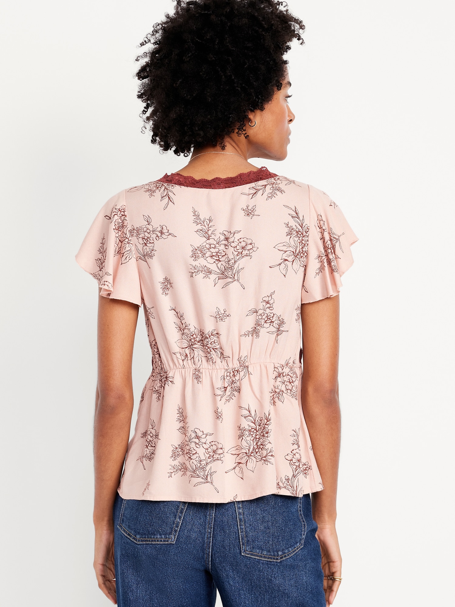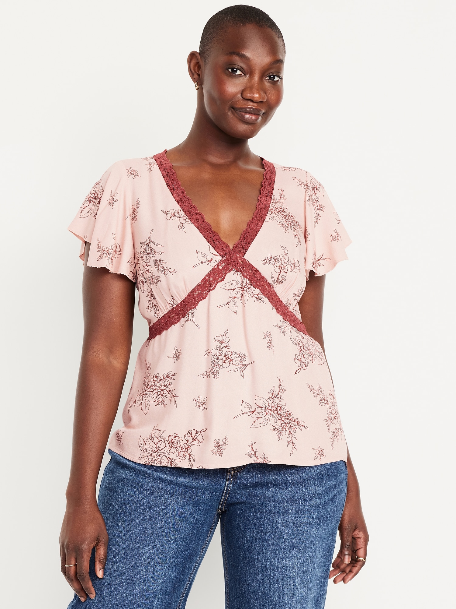 Lace-Trim V-Neck Crepe Top: lace-trim v-neck and bodice, short flutter sleeves, elastic back waist, shirred detail, #798558
