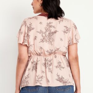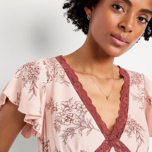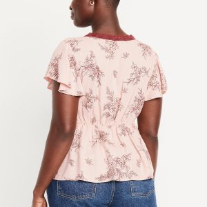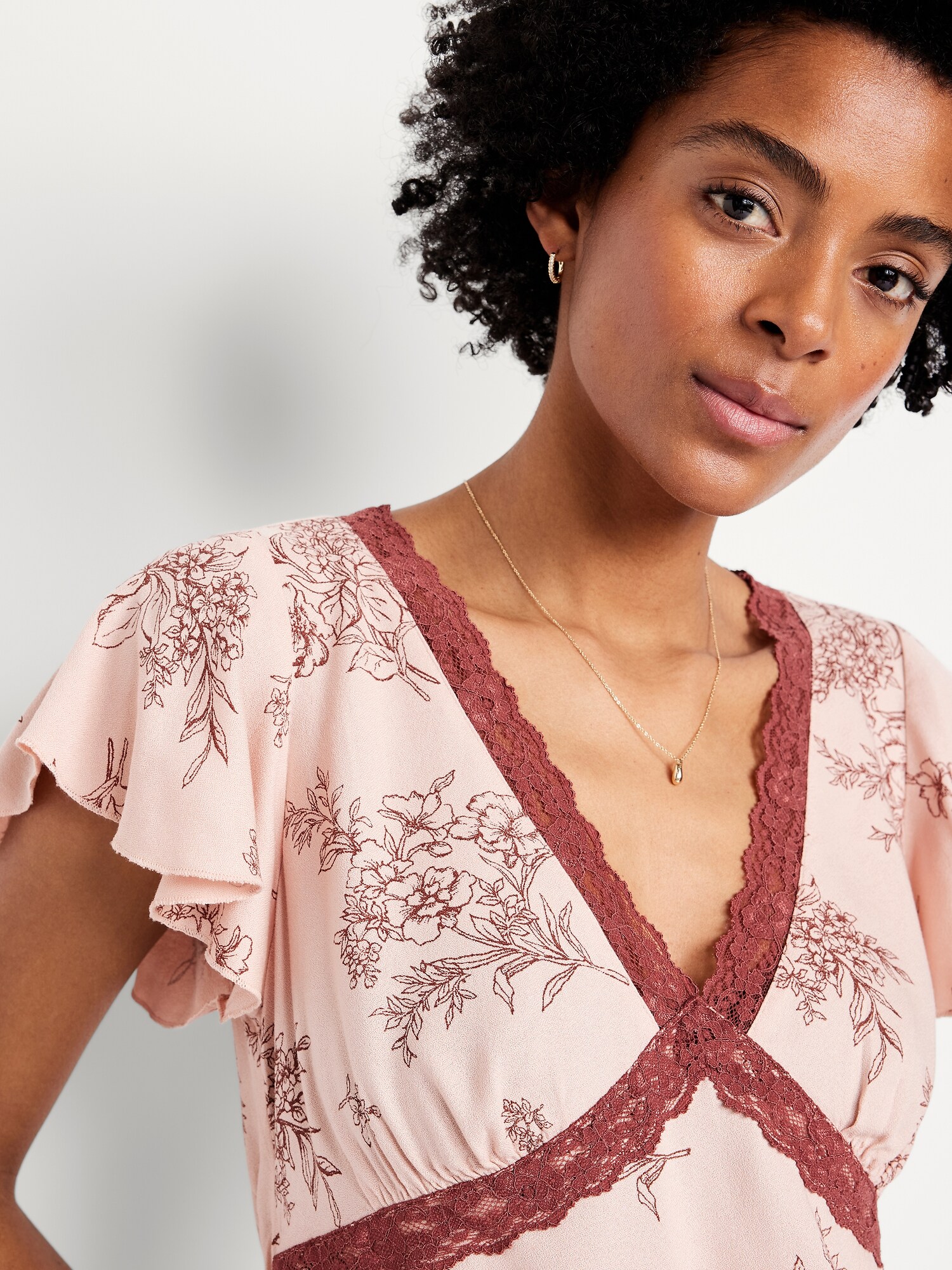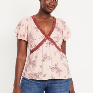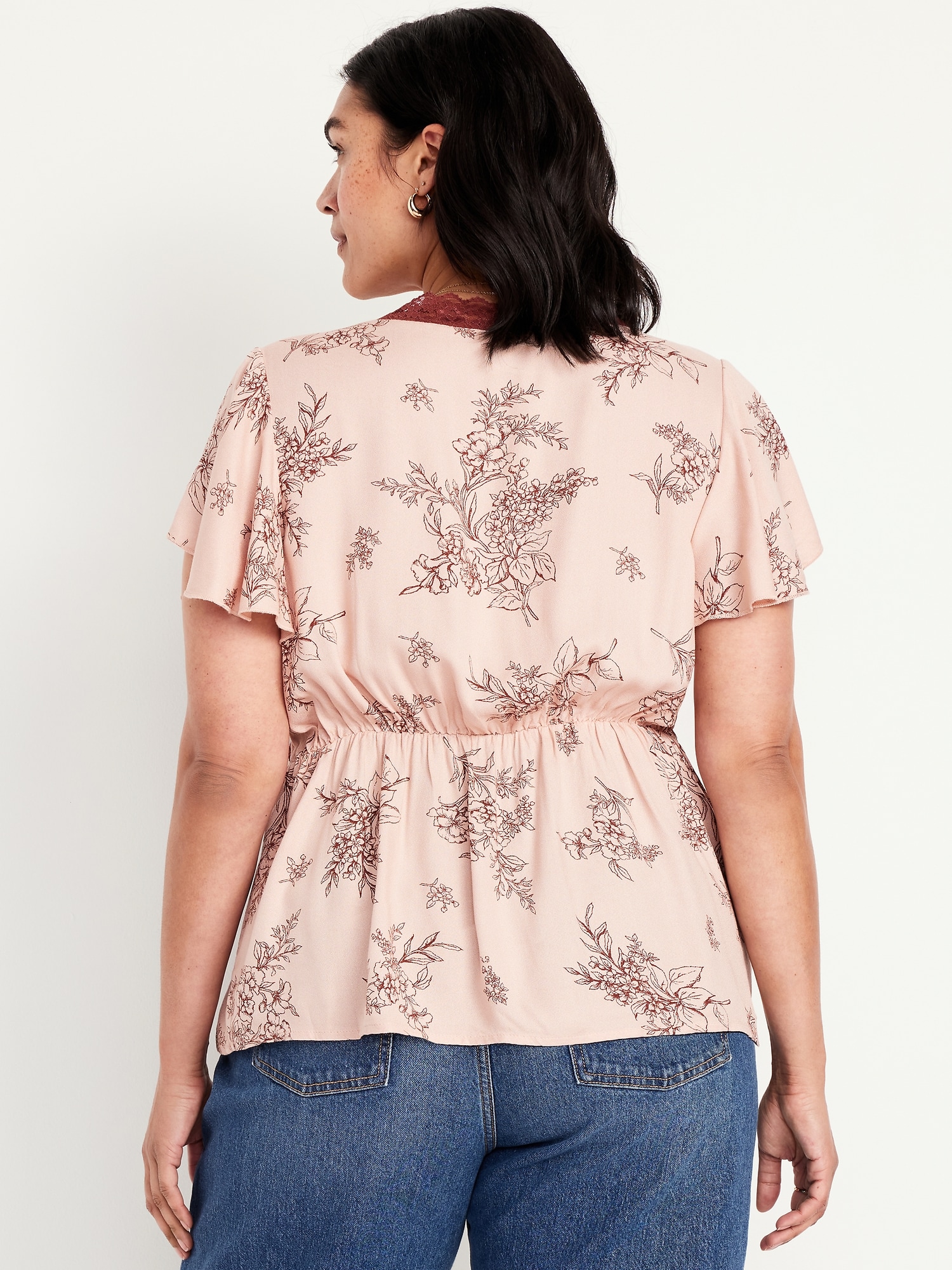 Lace-Trim V-Neck Crepe Top: lace-trim v-neck and bodice, short flutter sleeves, elastic back waist, shirred detail, #798558