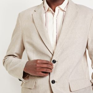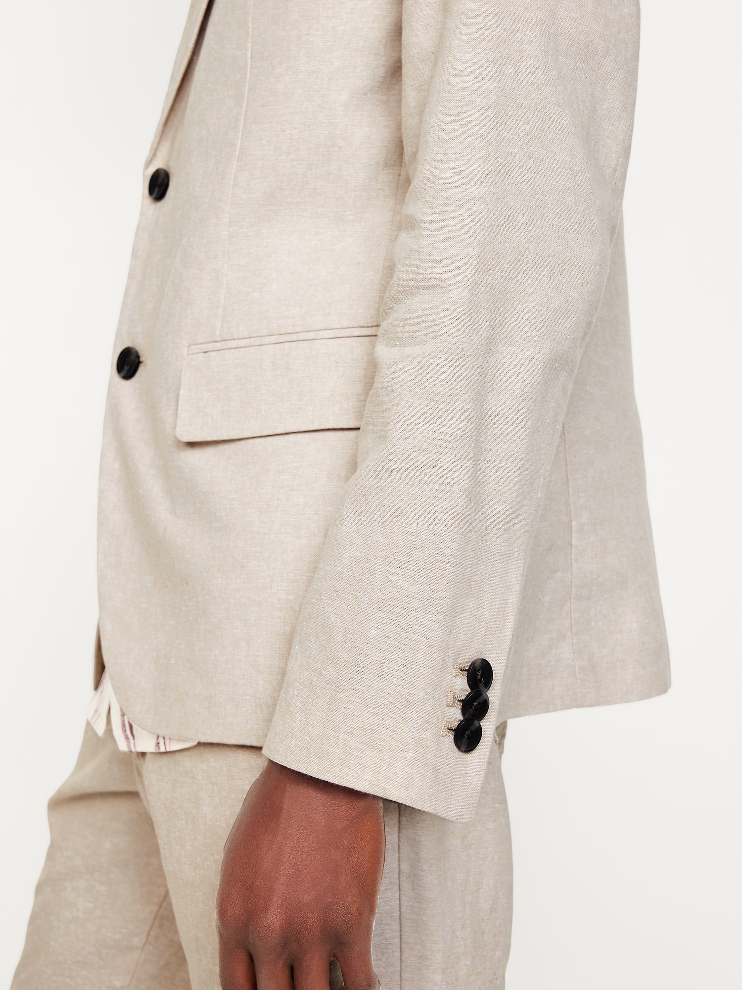 Linen-Blend Blazer: notched lapel, long sleeves, buttoned cuffs, two-button front, welt chest pocket, flap pockets, unlined, #762689