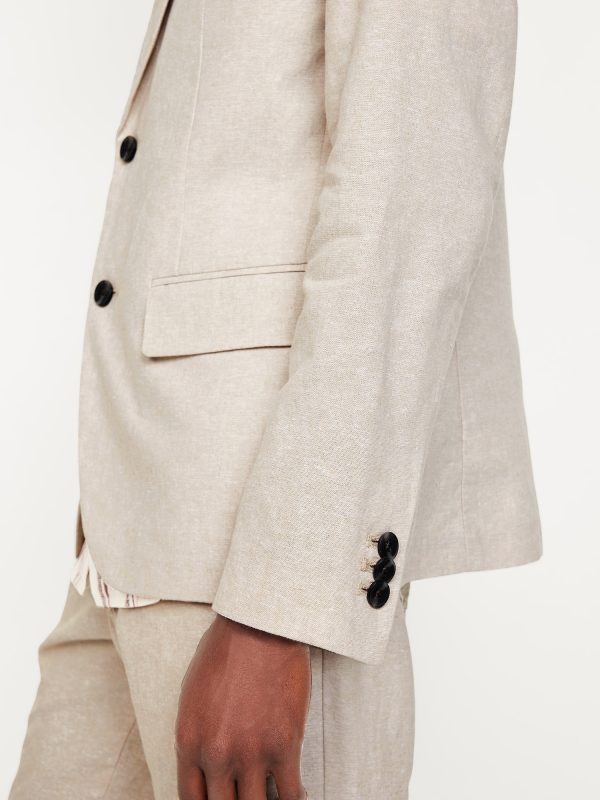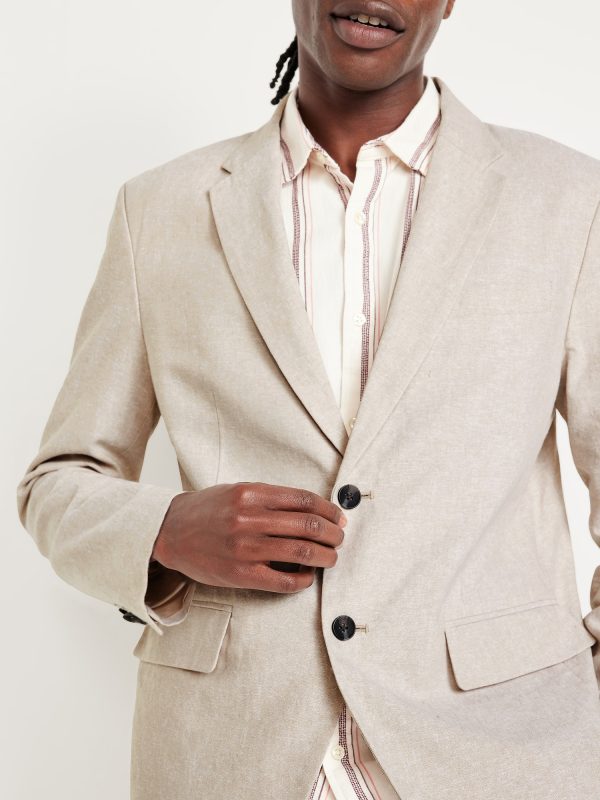Linen-Blend Blazer: notched lapel, long sleeves, buttoned cuffs, two-button front, welt chest pocket, flap pockets, unlined, #762689