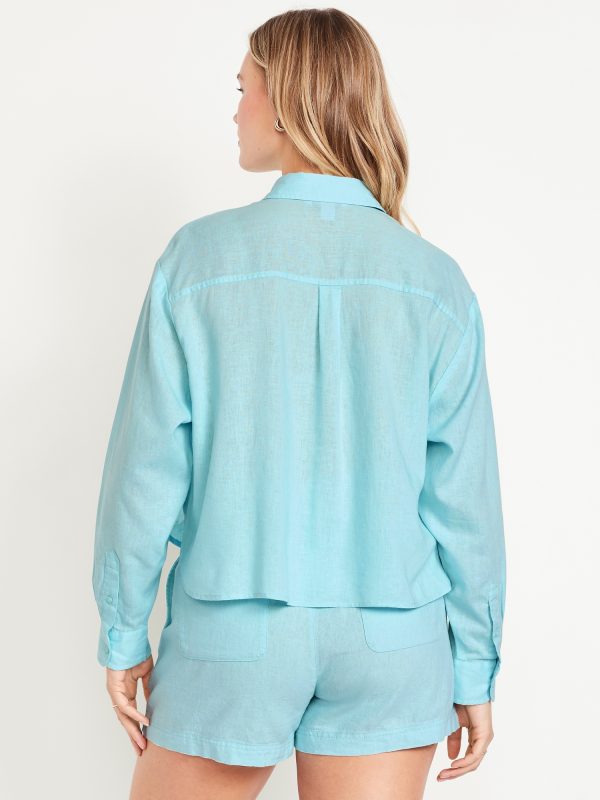 Linen-Blend Button-Down Crop Shirt: spread collar, long sleeves, buttoned cuffs, full-button front, patch chest pocket, #760758