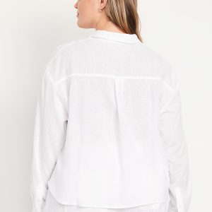 Linen-Blend Button-Down Crop Shirt: spread collar, long sleeves, buttoned cuffs, full-button front, patch chest pocket, #760758