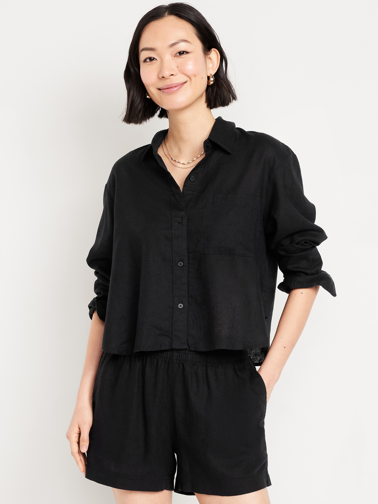 Linen-Blend Button-Down Crop Shirt: spread collar, long sleeves, buttoned cuffs, full-button front, patch chest pocket, #760758