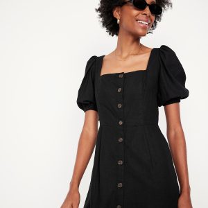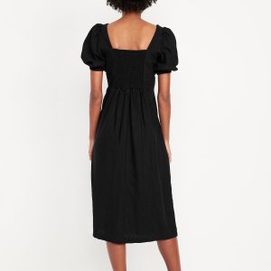 Linen-Blend Button-Front Midi Dress: square neck, short puff sleeves, full-button front, diagonal hip pockets, smocked back, #705471