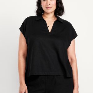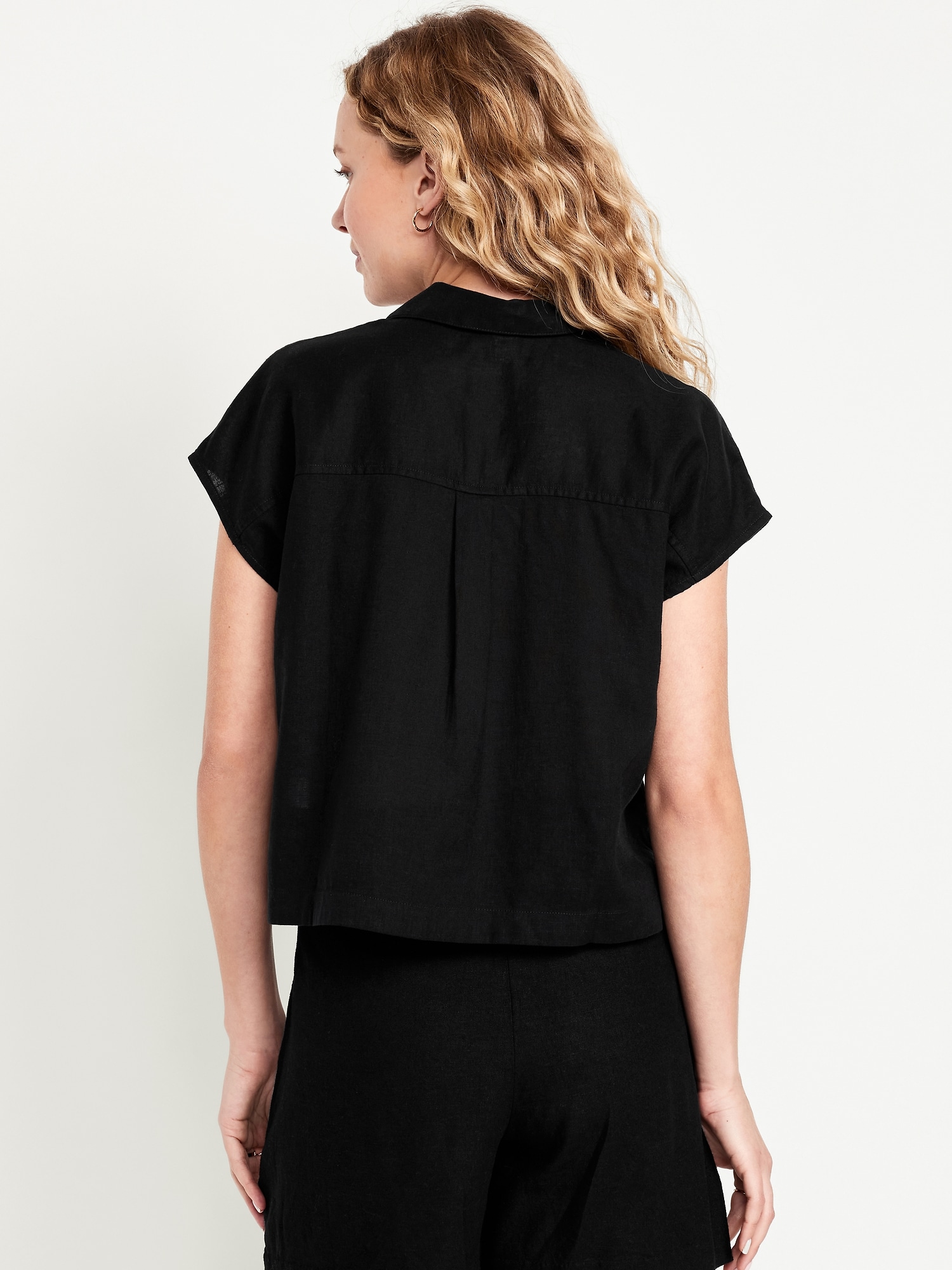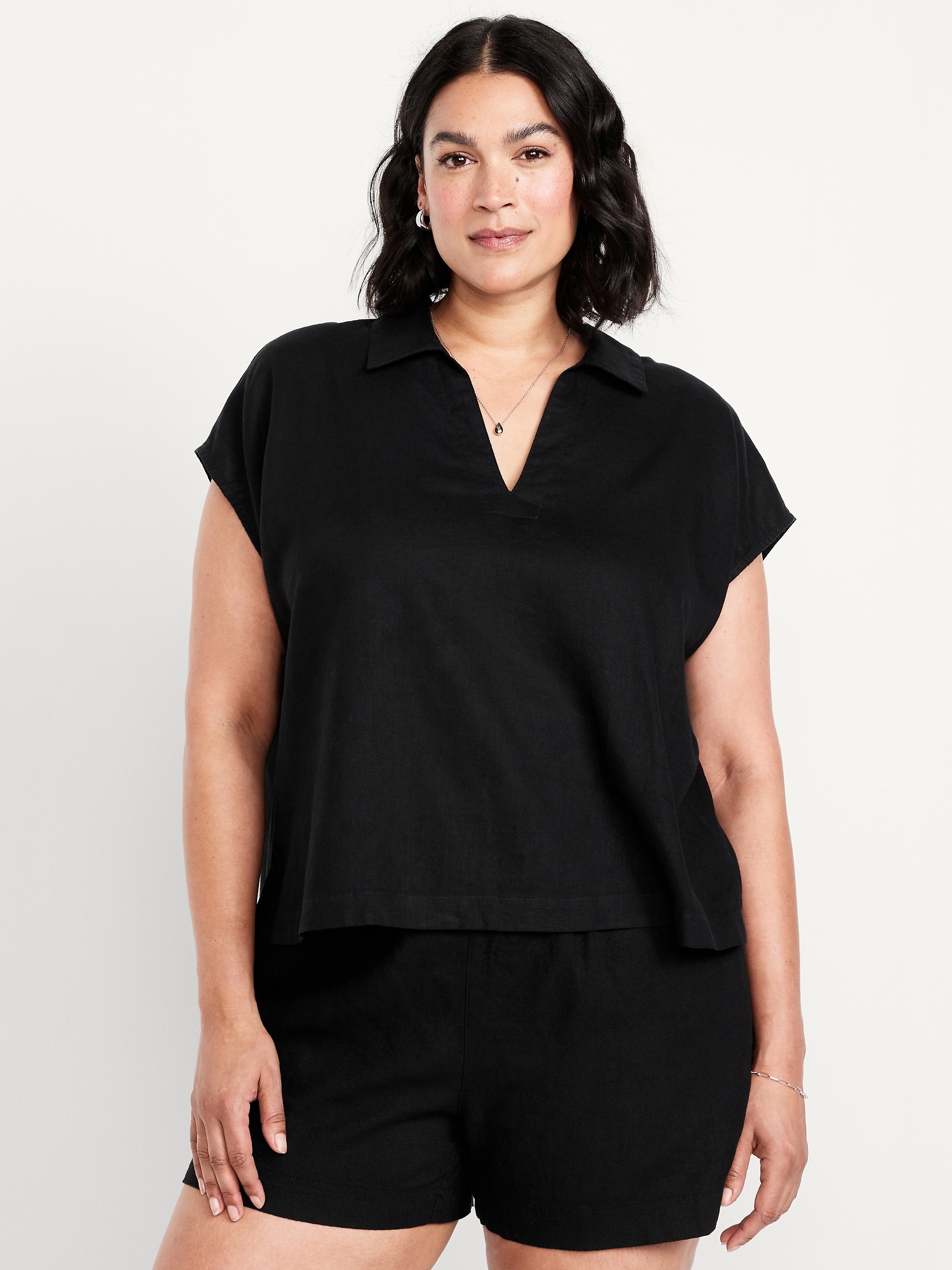 Linen-Blend Cropped Popover Shirt: spread v-neck collar, short dolman sleeves, seamed back yoke, easy popover style, #764183