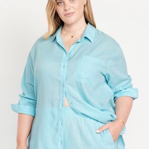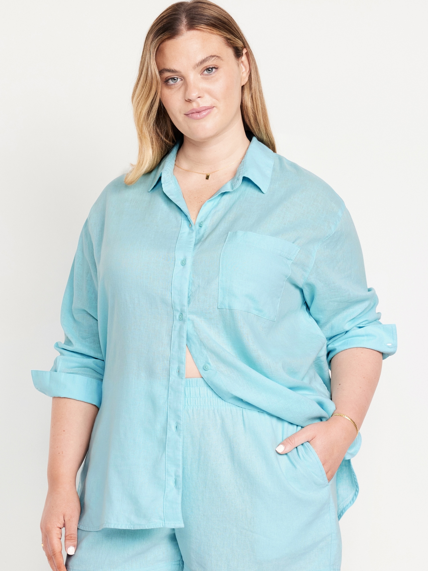 Linen-Blend Loose Button-Down Shirt: spread collar, long sleeves, buttoned cuffs, patch chest pocket, full-button front, striped print, curved hi-lo hem, #693623