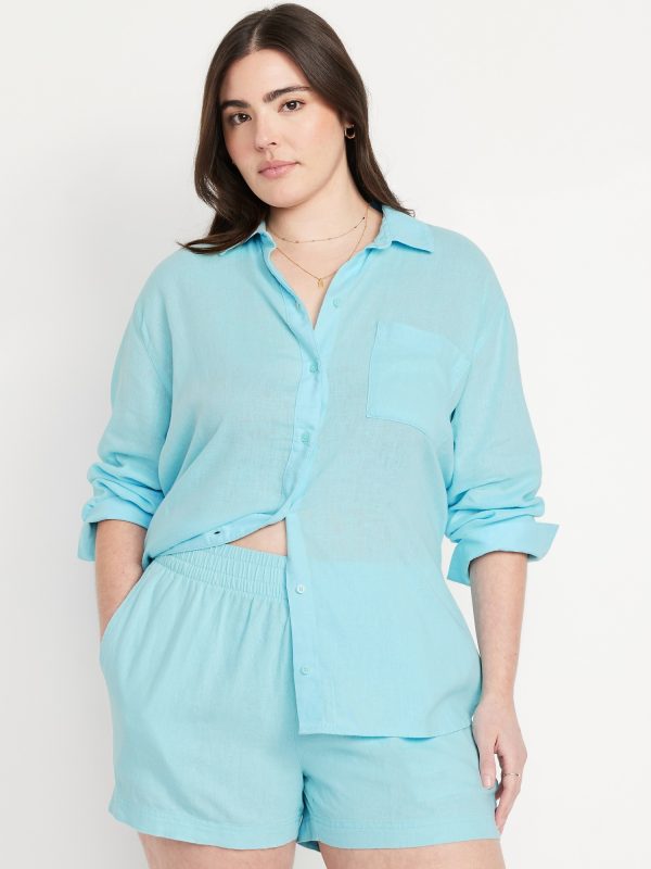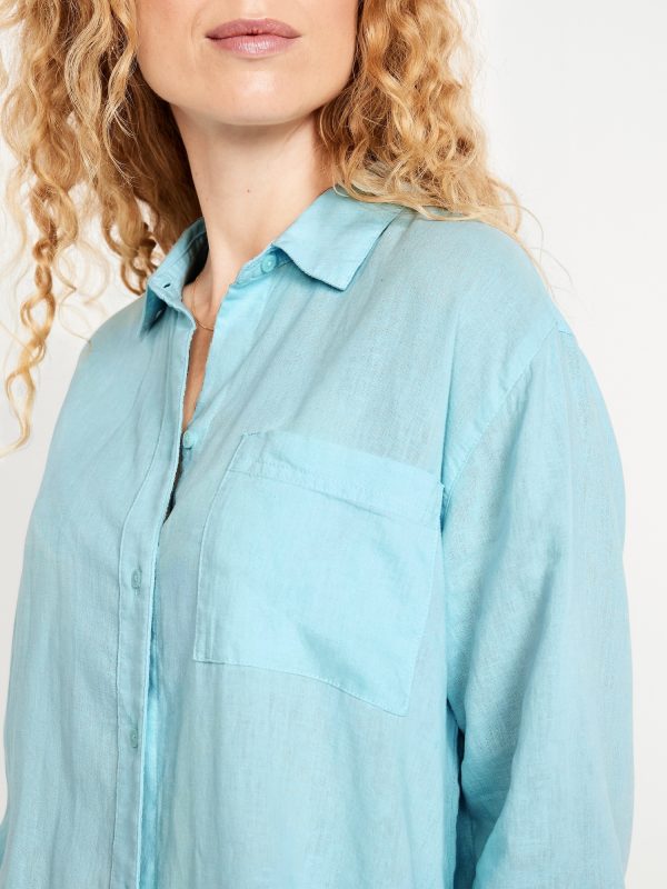 Linen-Blend Loose Button-Down Shirt: spread collar, long sleeves, buttoned cuffs, patch chest pocket, full-button front, striped print, curved hi-lo hem, #693623