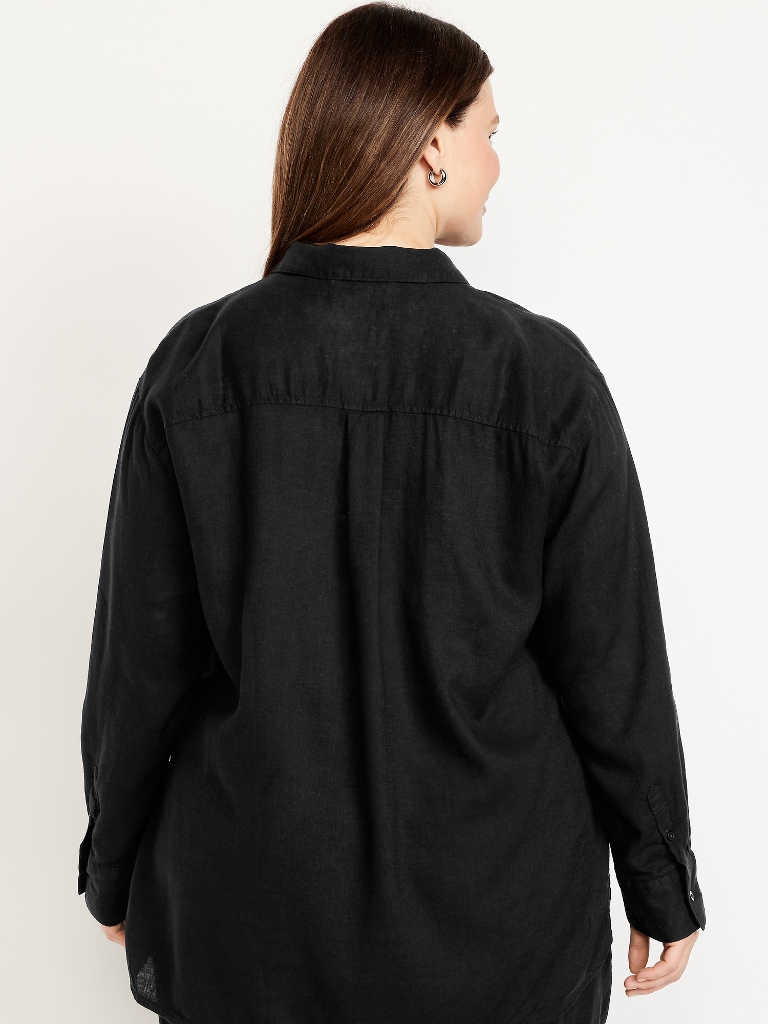Button-Down Linen-Blend Striped Shirt: spread collar, long sleeves, buttoned cuffs, patch chest pocket, full-button front, striped print, curved hi-lo hem, #693623
