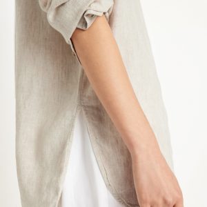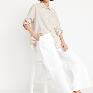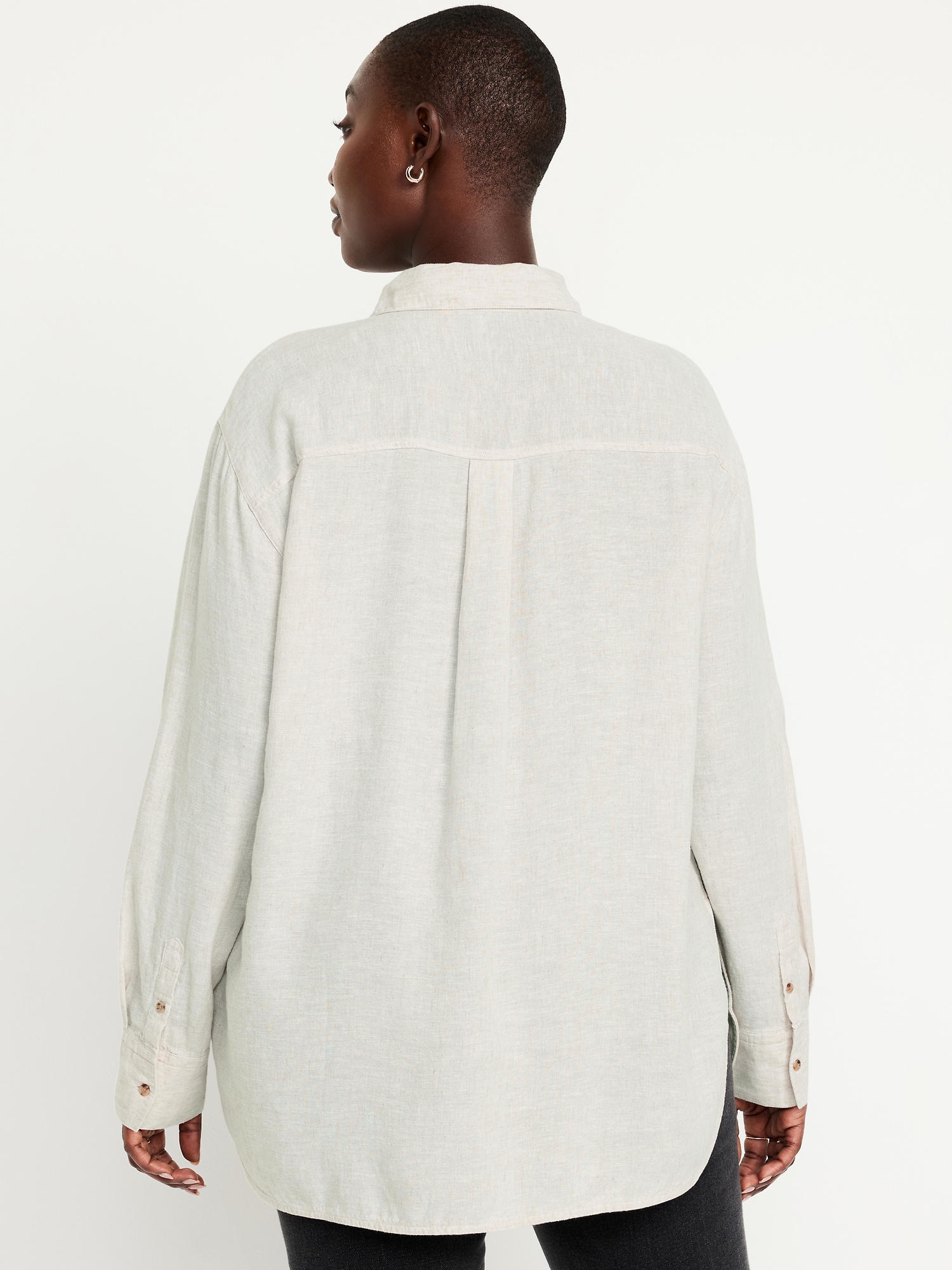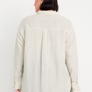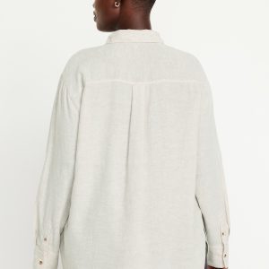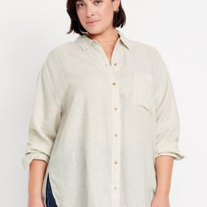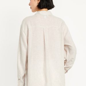 Linen-Blend Loose Button-Down Shirt: spread collar, long sleeves, buttoned cuffs, patch chest pocket, full-button front, striped print, curved hi-lo hem, #693623