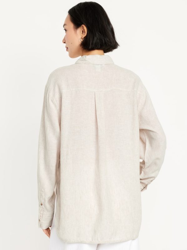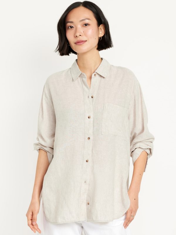 Linen-Blend Loose Button-Down Shirt: spread collar, long sleeves, buttoned cuffs, patch chest pocket, full-button front, striped print, curved hi-lo hem, #693623