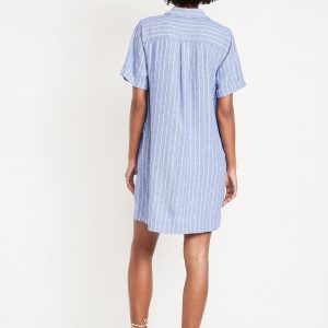 Linen-Blend Mini Shirt Dress: spread collar, short sleeves, full-button front, patch chest pocket, striped print, #766933