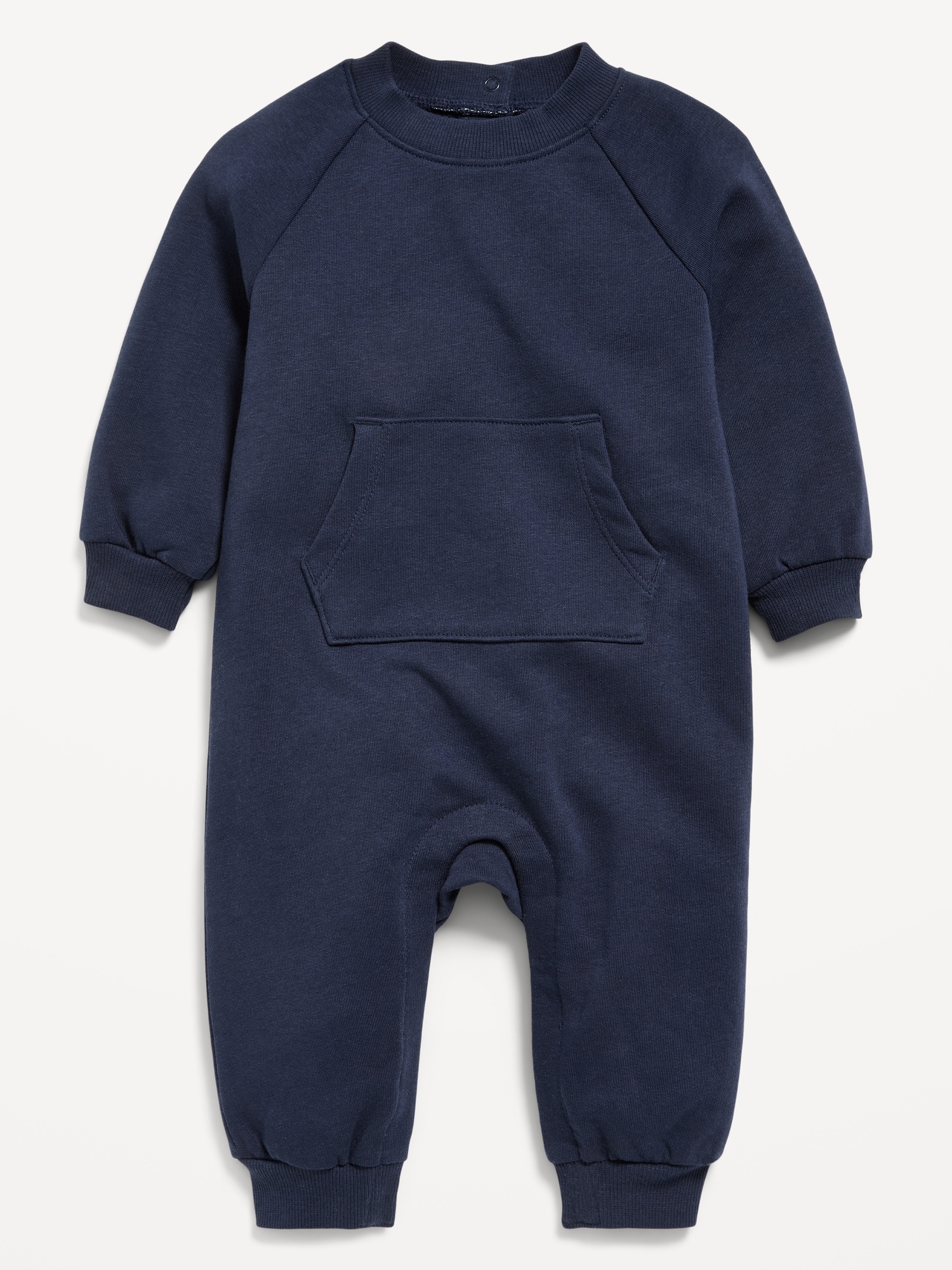 Long-Sleeve Fleece One-Piece Jumpsuit for Baby: crew neck, long sleeves, snap-button placket at nape, kangaroo pocket, hidden snaps along inseam, #802627