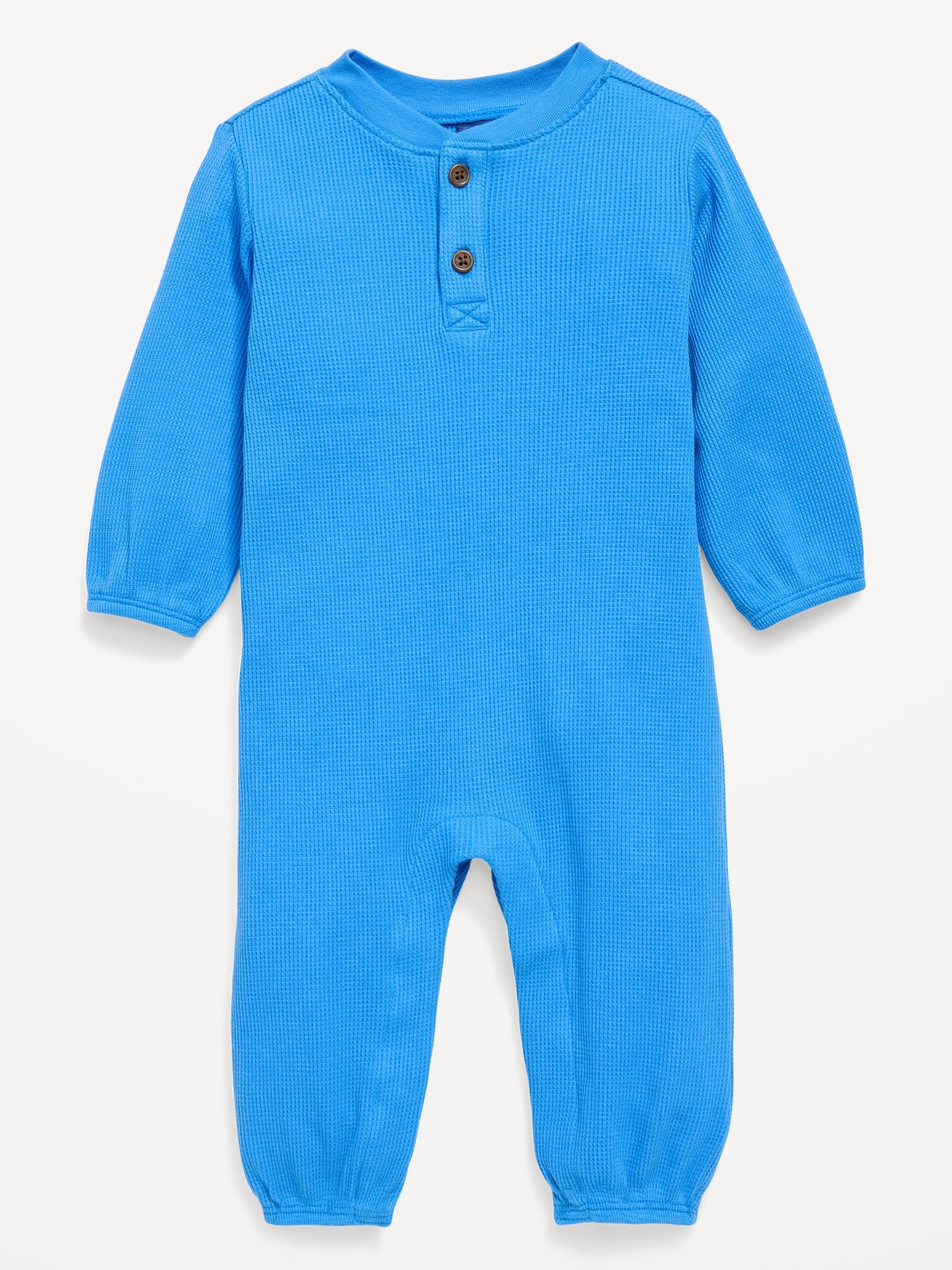 Long-Sleeve Waffle-Knit Henley One-Piece for Baby: crew neck, two-button henley placket, long sleeves, hidden snaps along inseam, #804450