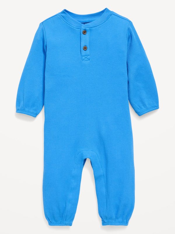 Long-Sleeve Waffle-Knit Henley One-Piece for Baby: crew neck, two-button henley placket, long sleeves, hidden snaps along inseam, #804450