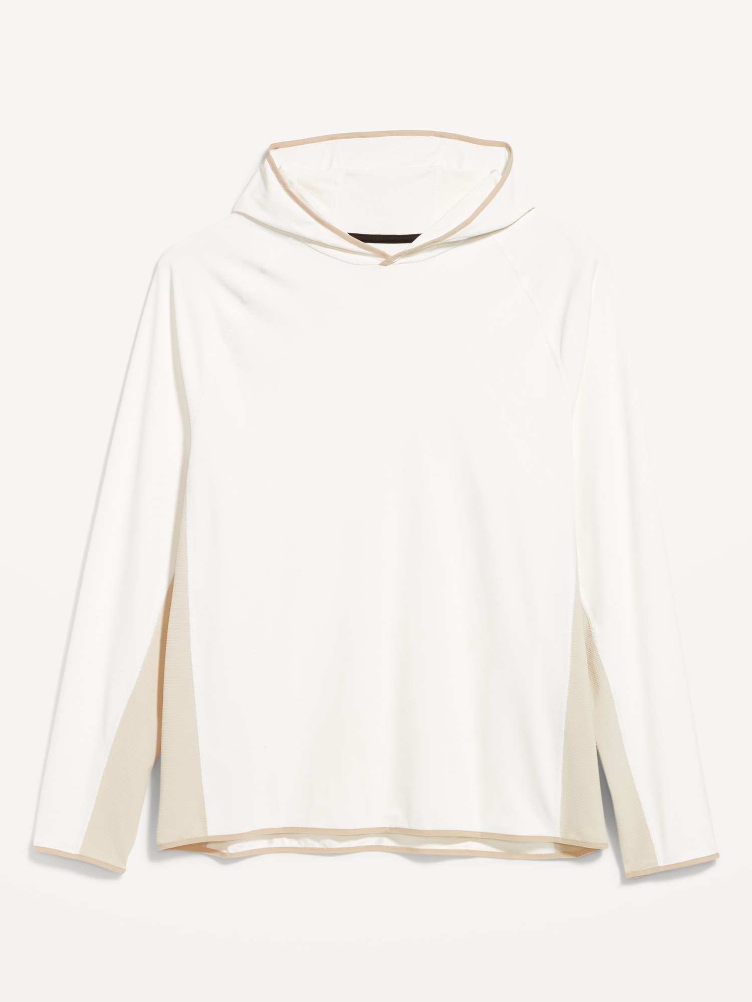 Loose Fit Pullover Run Hoodie: built-in hood, long raglan sleeves, reflective trim at center back, go-dry cool wicks moisture and keeps you cool, breathable, pullover style, #749723