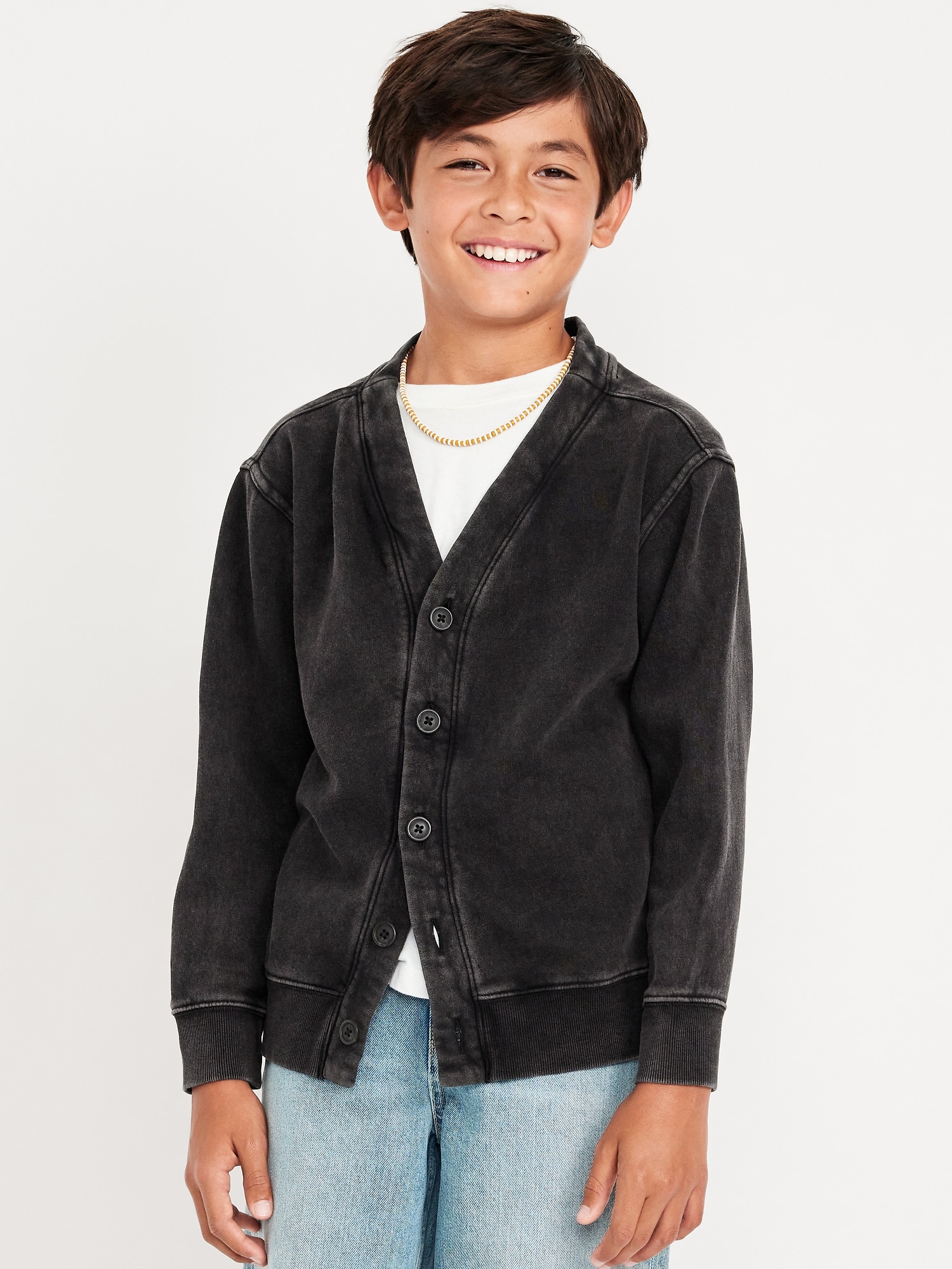 Loose Fleece Cardigan Sweater for Boys: v neck, long sleeves, drop shoulders, buttoned placket, #805539