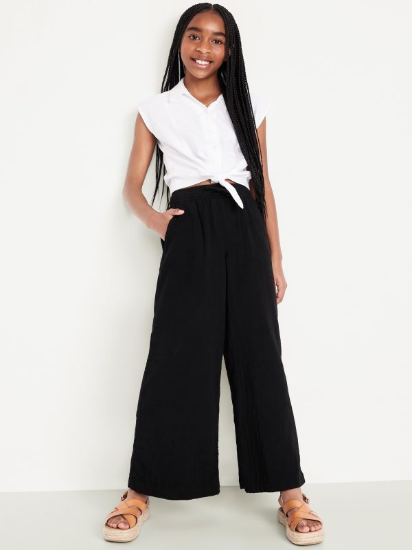 Loose Printed High-Waisted Double-Weave Wide-Leg Pants for Girls: elasticized waistband, high rise, functional drawstring, diagonal on-seam pockets, wide leg, easy pull-on style, #704705