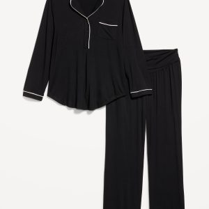 Maternity Classic Pajama Set: set includes pajama shirt and matching pants, notched collar, long sleeves, three-button popover placket, patch chest pocket, foldover-waist pajama pants for pull-on styling, #601460