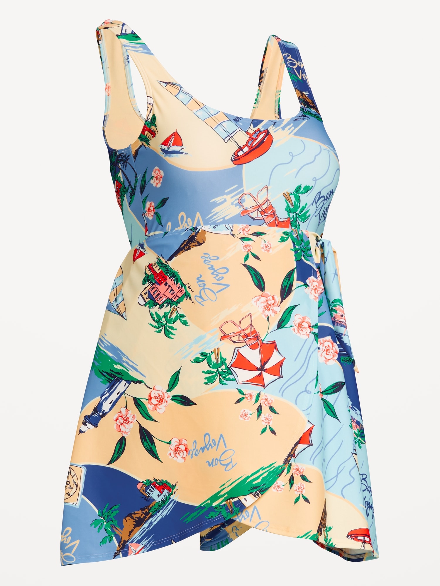 Maternity Classic Wrap Pique Swim Dress: square neck, sleeveless, removable pads, built-in briefs, side-tie, #756110