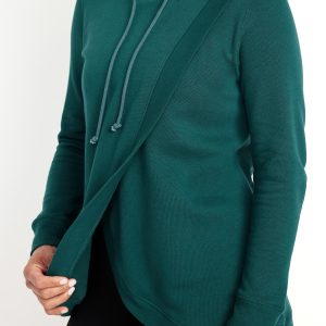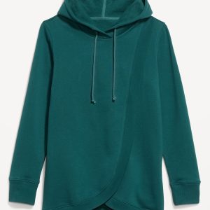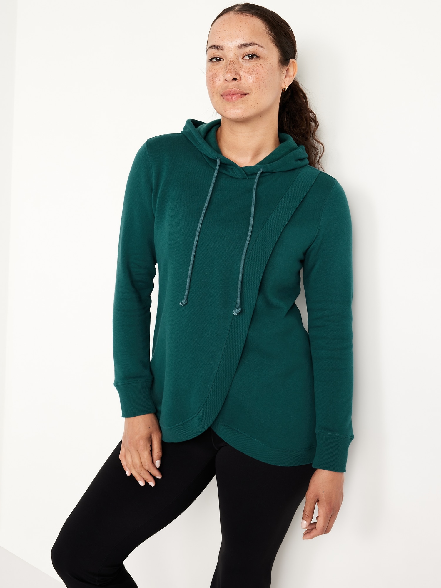 Maternity Cross-Front Nursing Pullover Hoodie: adjustable drawstring hood, long sleeves, rib-knit cuffs, cross front for convenient nursing access, rib-knit front and hem, pullover style, #578188