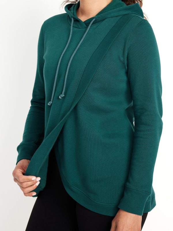 Maternity Cross-Front Nursing Pullover Hoodie: adjustable drawstring hood, long sleeves, rib-knit cuffs, cross front for convenient nursing access, rib-knit front and hem, pullover style, #578188